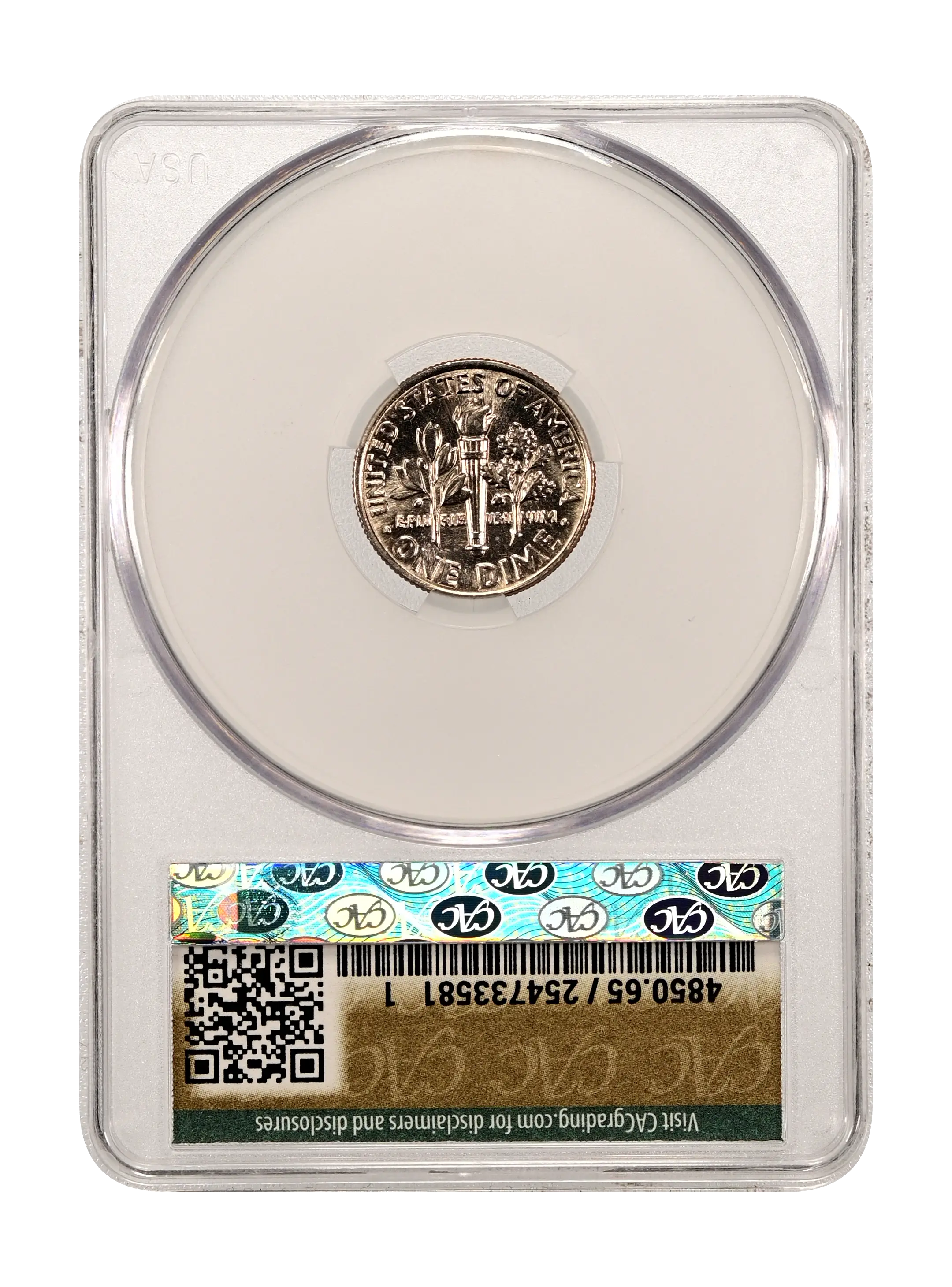 Regardless of date, Full Bands (or "FB") Roosevelt dimes, which show complete horizontal lines on the bands across the torch on the reverse, are valued by enthusiasts. Both the 90% silver (1946-1964) and copper-nickel (1965-present) FB Roosevelt dimes are scarce and command substantial premiums over similarly graded non-FB specimens.