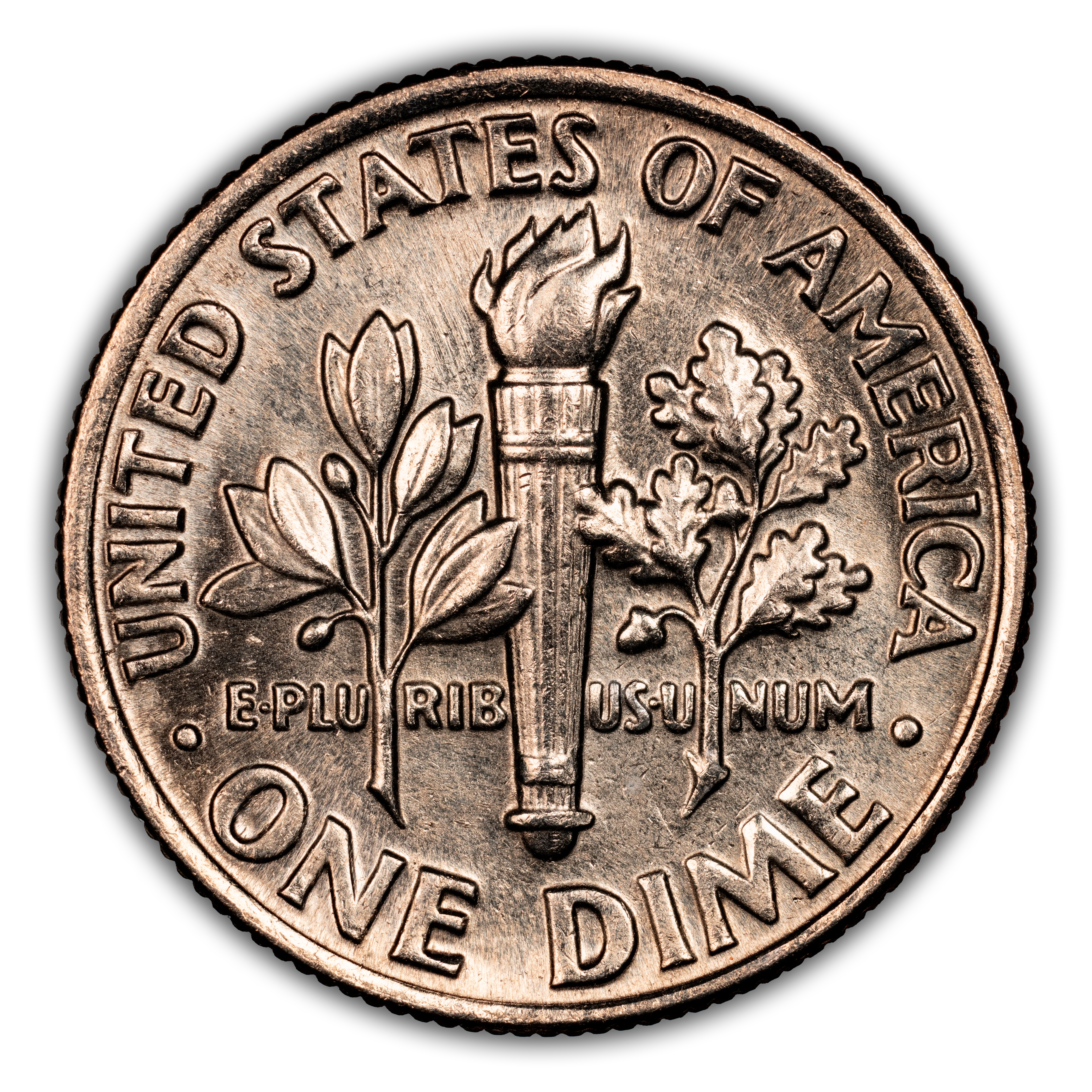 Reverse: Torch of Liberty is flanked by olive branches in the center with UNITED STATES OF AMERICA * ONE DIME around the circumference.