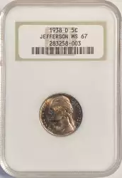 Reverse: The Jefferson home is prominently centered with the name MONTICELLO captioned below. The denomination FIVE CENTS is spelled out in half circle underneath and the words E PLURIBUS UNUM and UNITED STATES OF AMERICA appear at the top and bottom periphery.