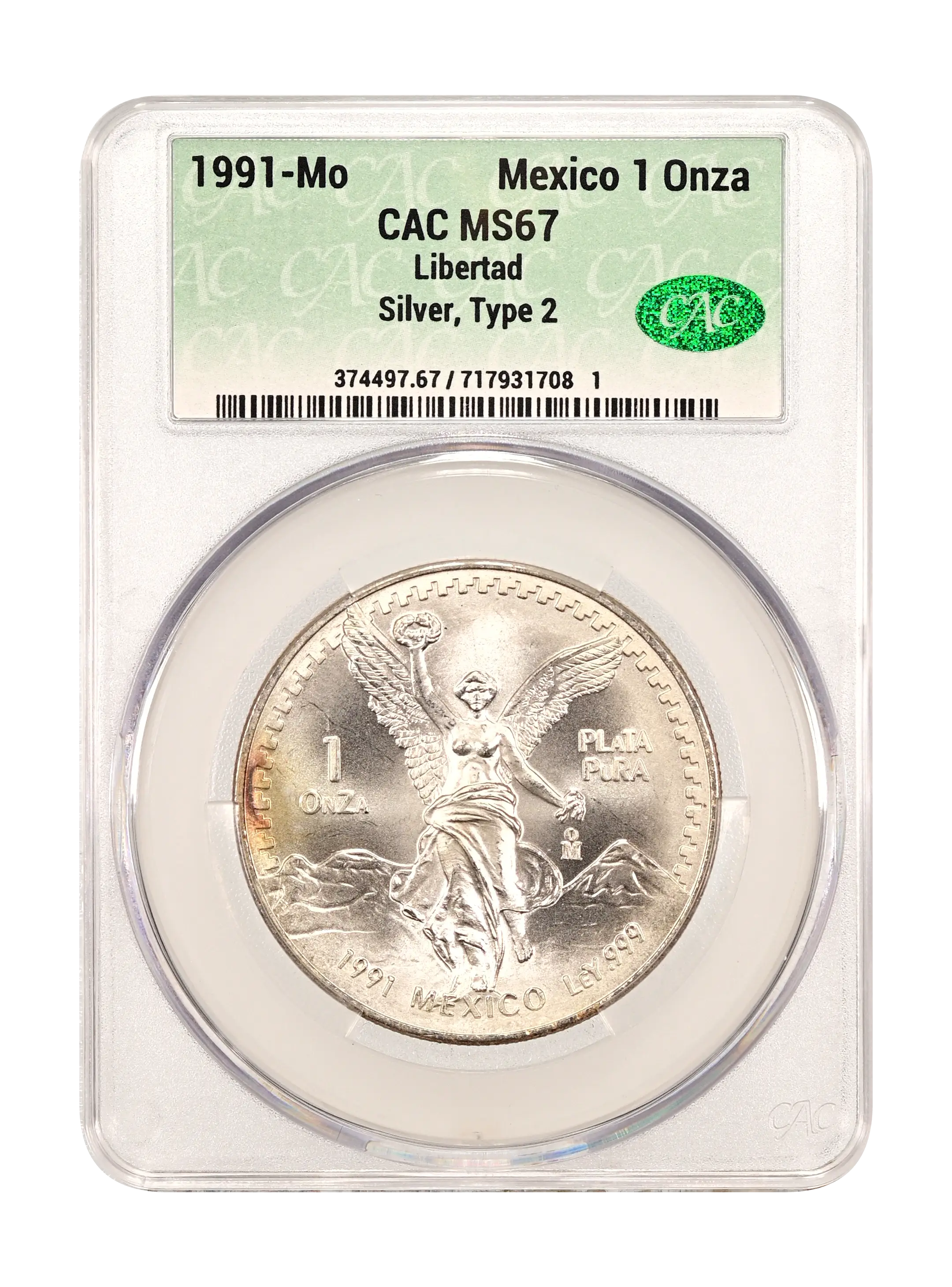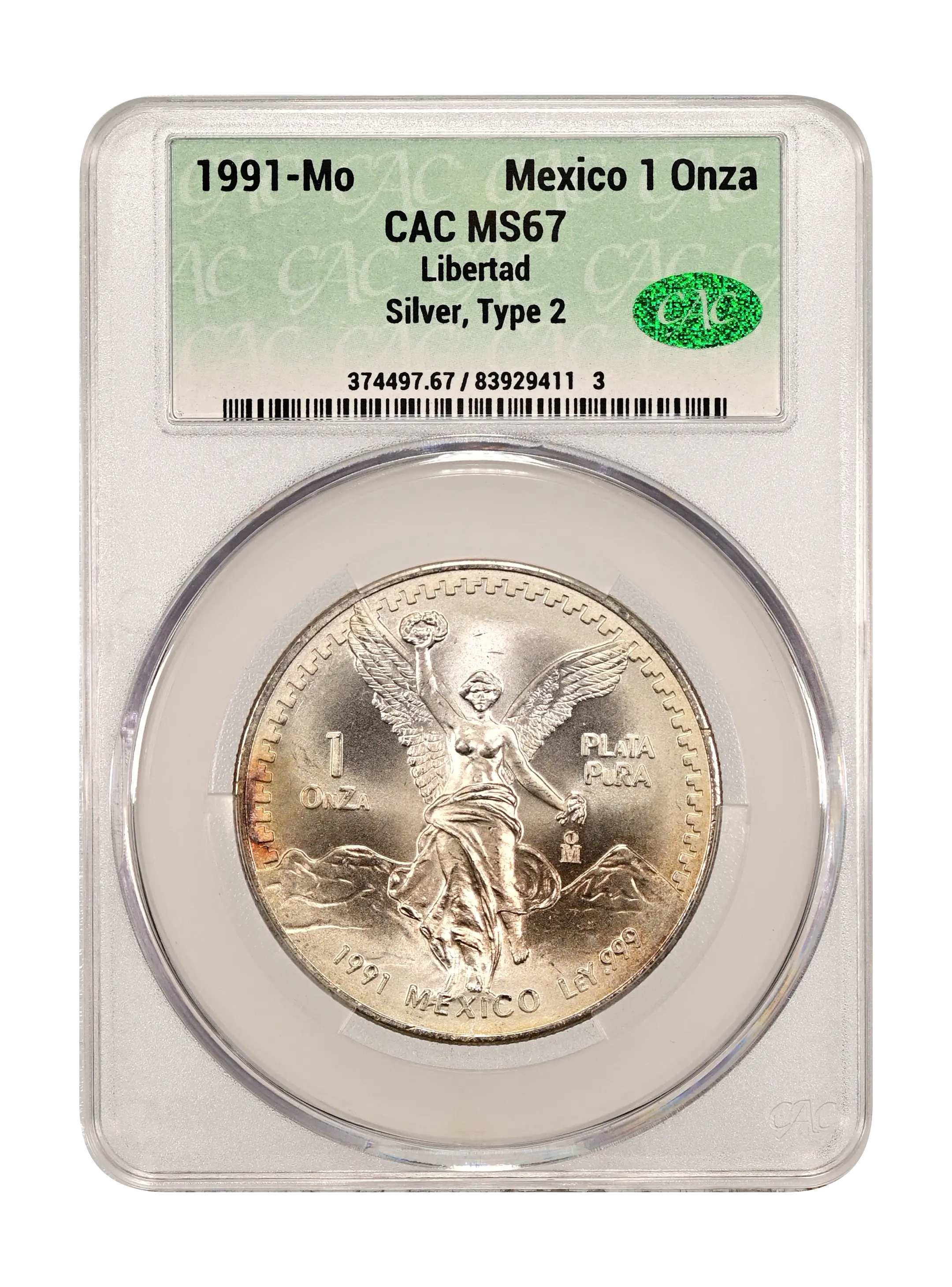 1991-Mo Libertad Mexico 1 Onza Silver, Type 2 CAC MS67