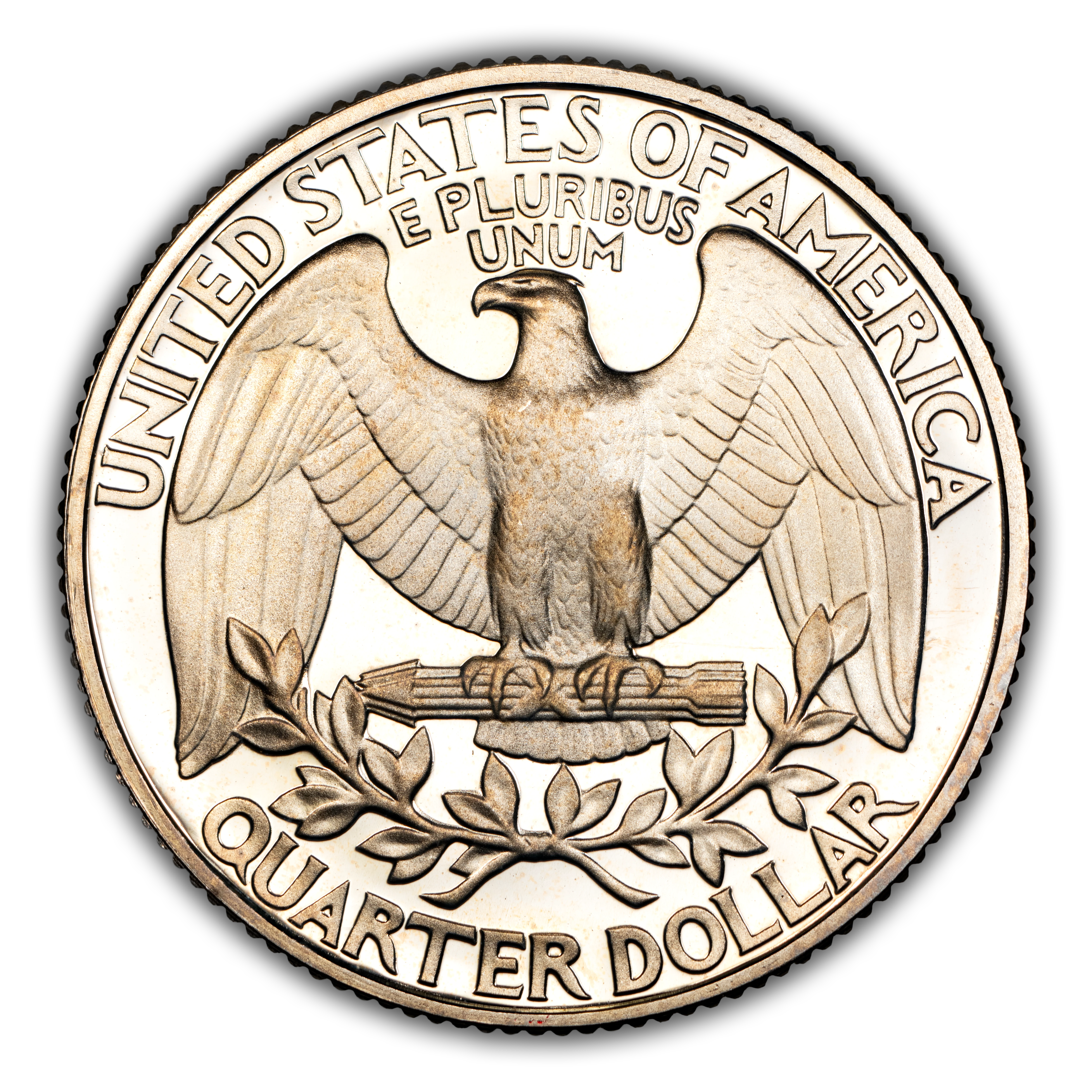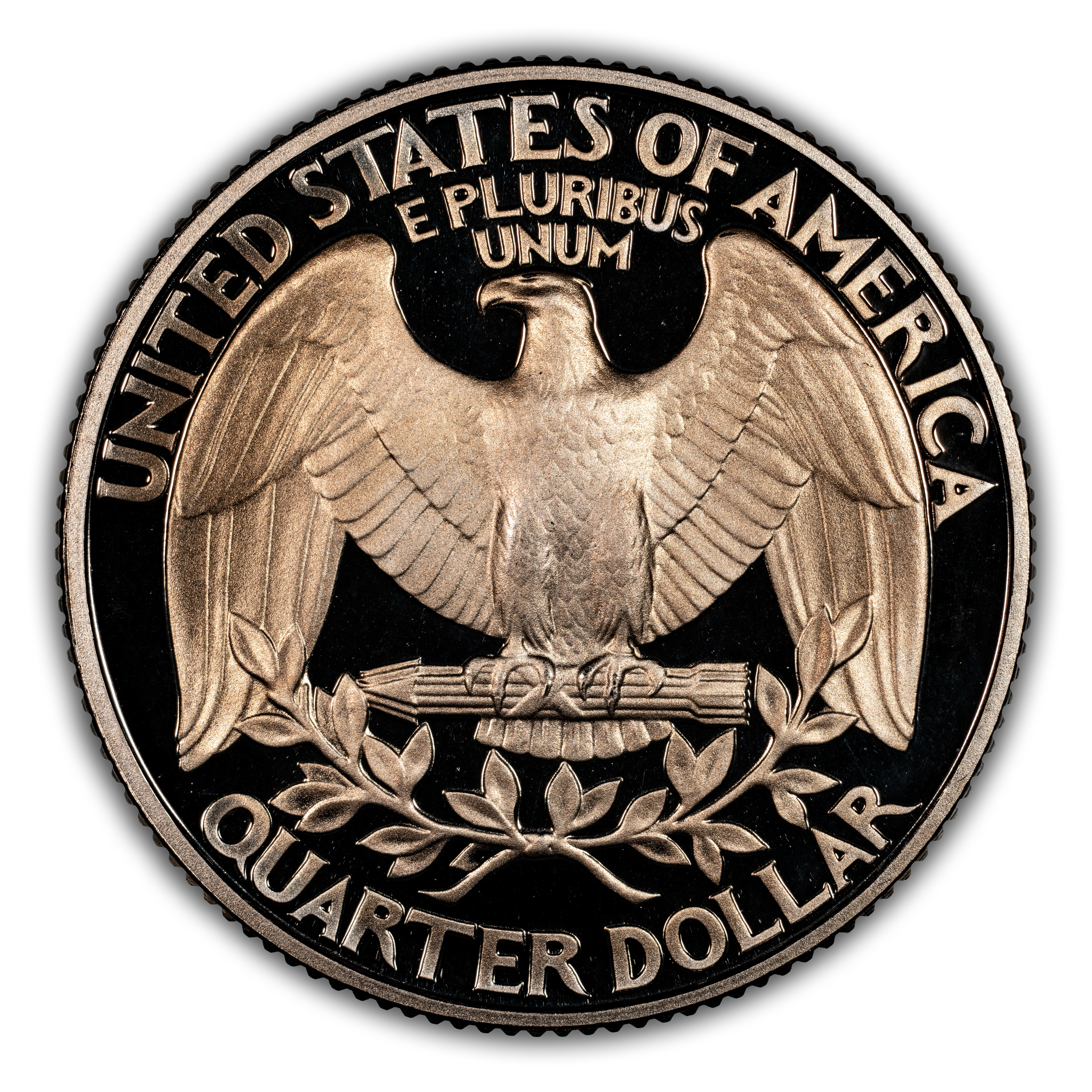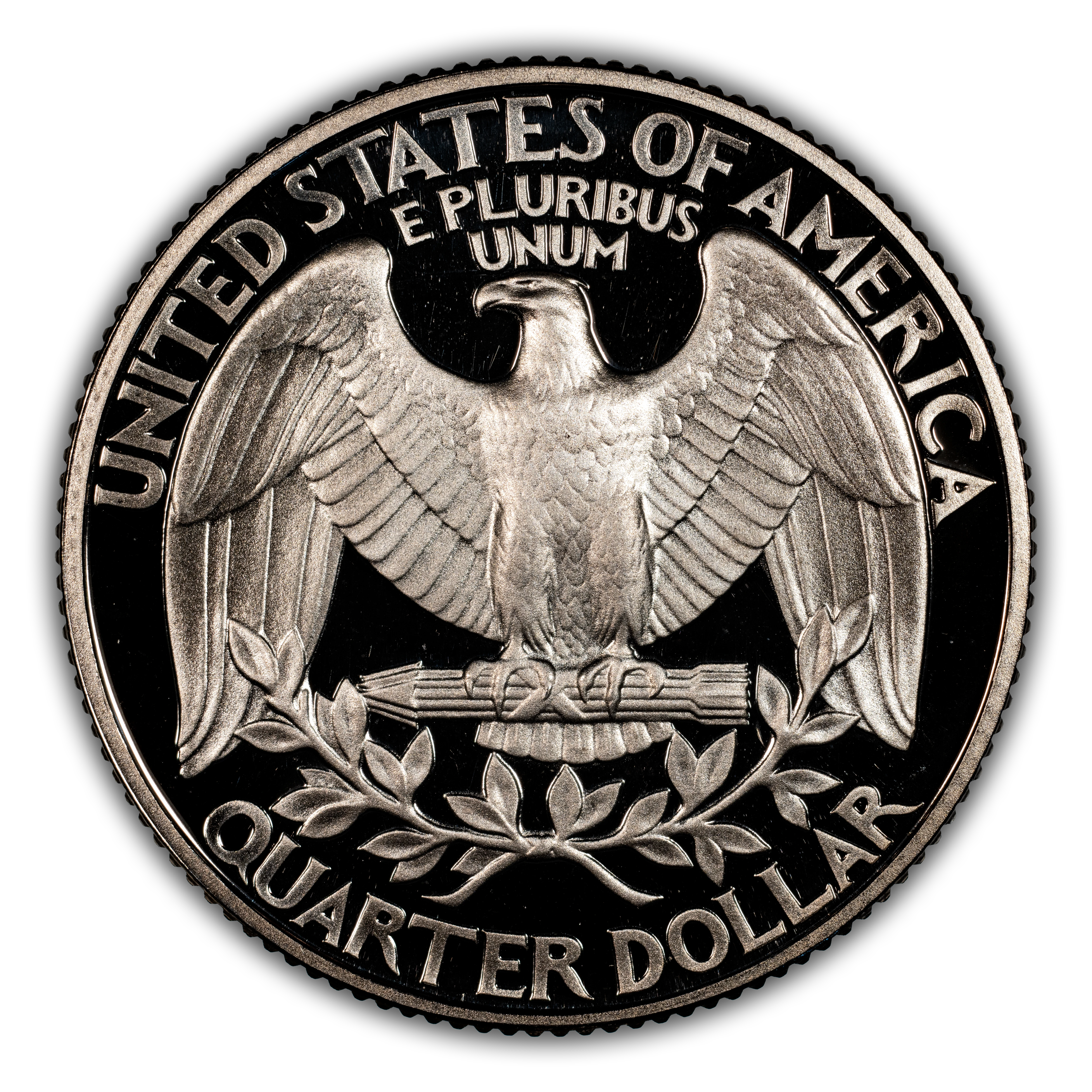 Reverse: Large eagle with wings fully extended, clutching a bundle of arrows with the words UNITED STATES OF AMERICA at the top periphery; QUARTER DOLLAR at the bottom. An olive leaf is positioned between the eagle and the denomination.