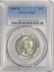 Reverse: Large eagle with wings fully extended, clutching a bundle of arrows with the words UNITED STATES OF AMERICA at the top periphery; QUARTER DOLLAR at the bottom. An olive leaf is positioned between the eagle and the denomination.