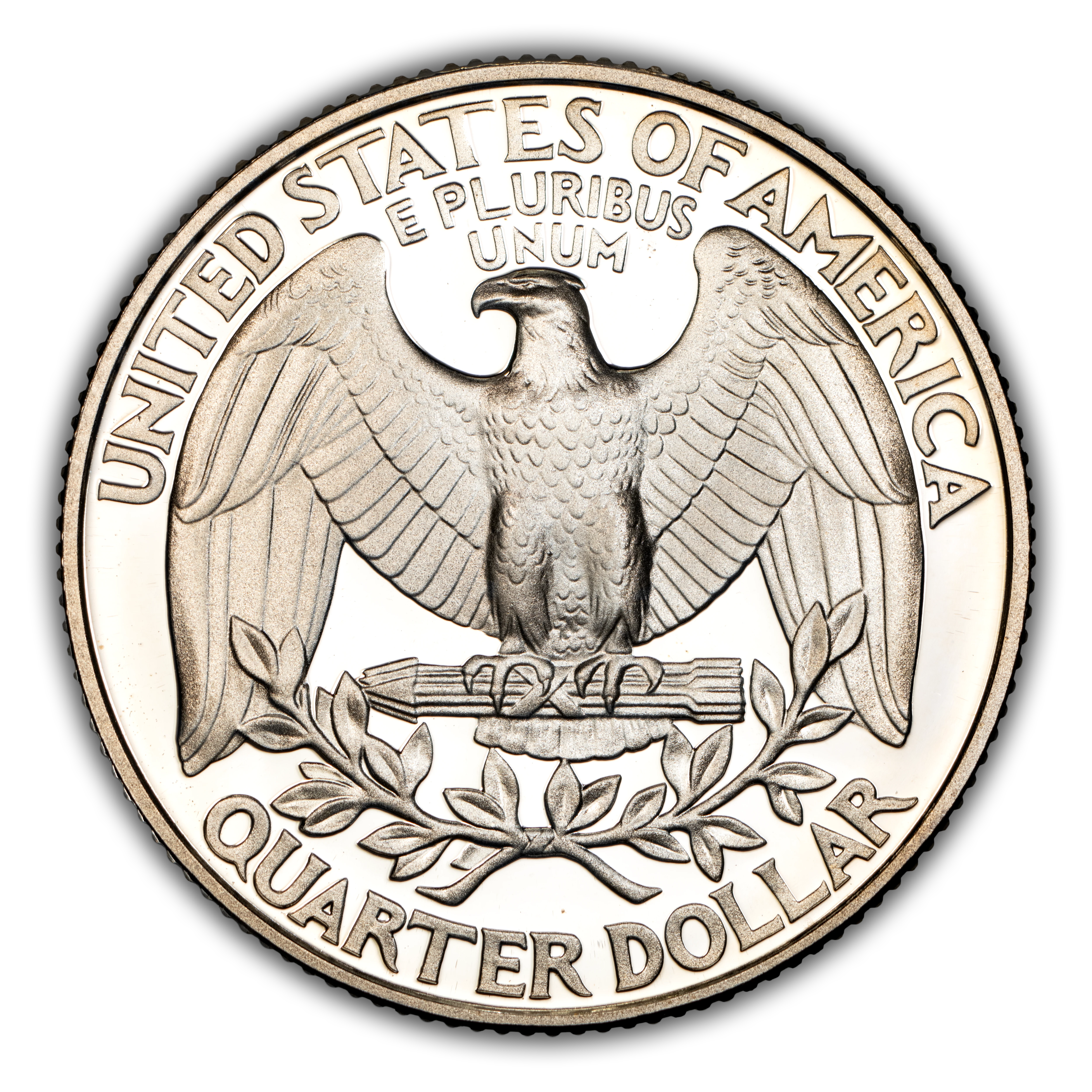 Reverse: Large eagle with wings fully extended, clutching a bundle of arrows with the words UNITED STATES OF AMERICA at the top periphery; QUARTER DOLLAR at the bottom. An olive leaf is positioned between the eagle and the denomination.