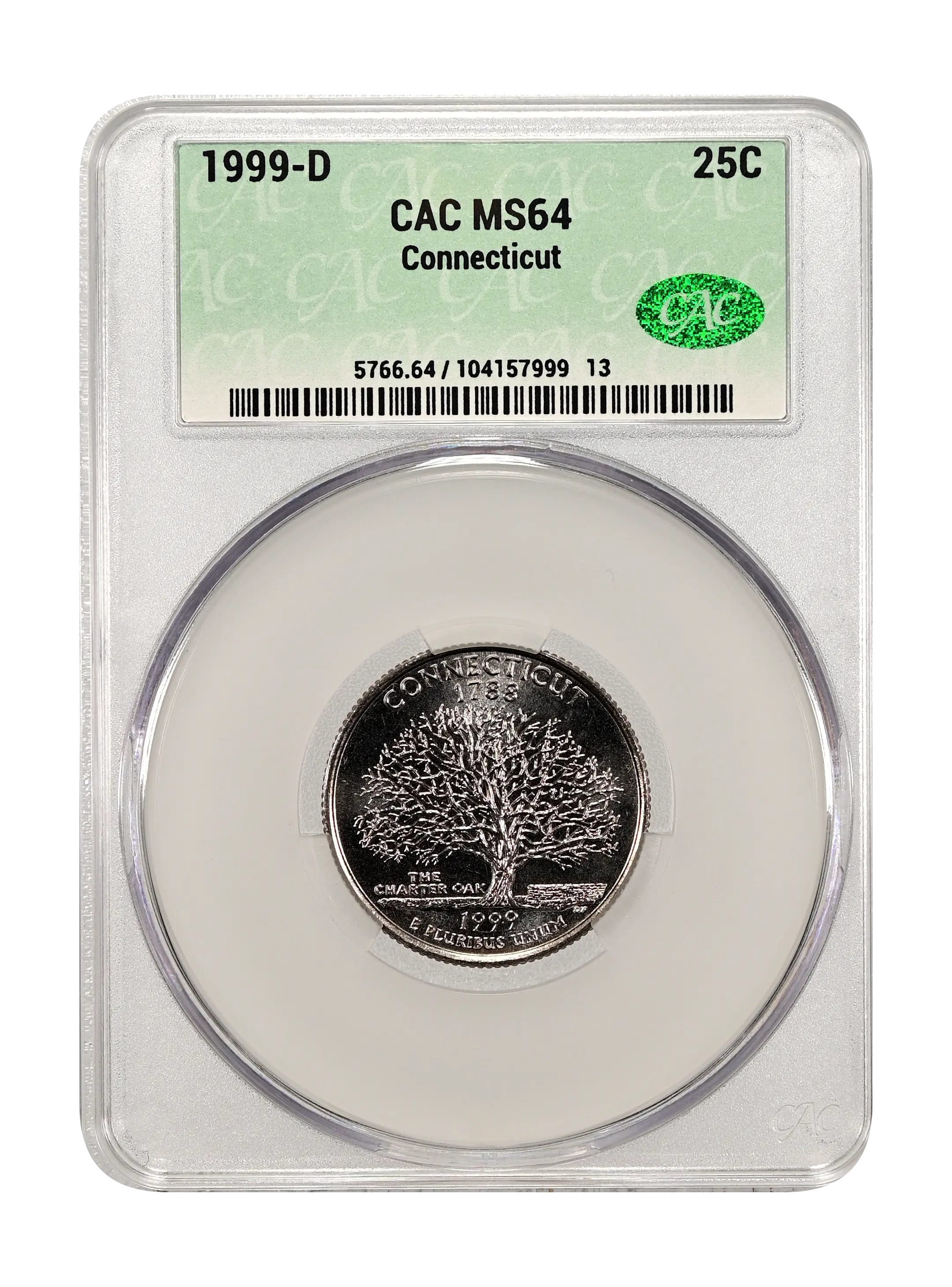1999-D 25C Connecticut -- Reverse Clad Layer Missing -- MS62 PCGS. PCGS Population: (12/2631 and 0/10+). NGC Census: (4/228...