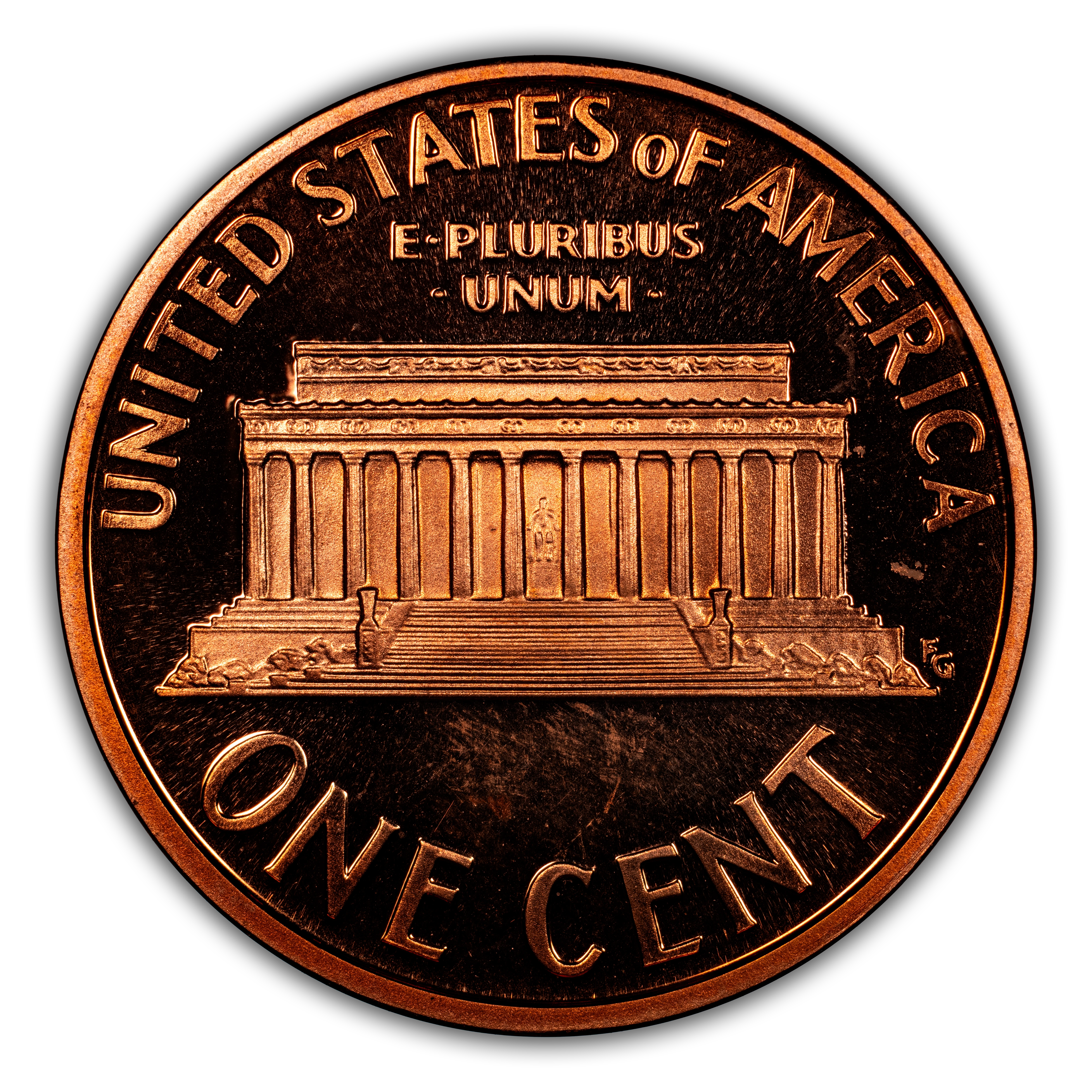 Reverse: Lincoln memorial building centered with words ONE CENT, UNITED STATES OF AMERICA on top and bottom periphery. E PLURIBUS UNUM centered above the top of the memorial.