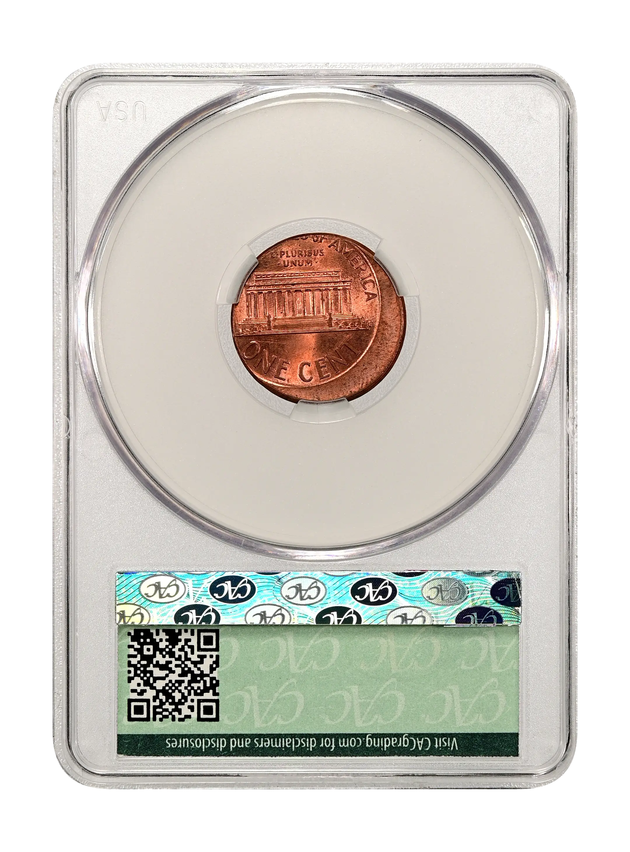 Reverse: Lincoln memorial building centered with words ONE CENT, UNITED STATES OF AMERICA on top and bottom periphery. E PLURIBUS UNUM centered above the top of the memorial.