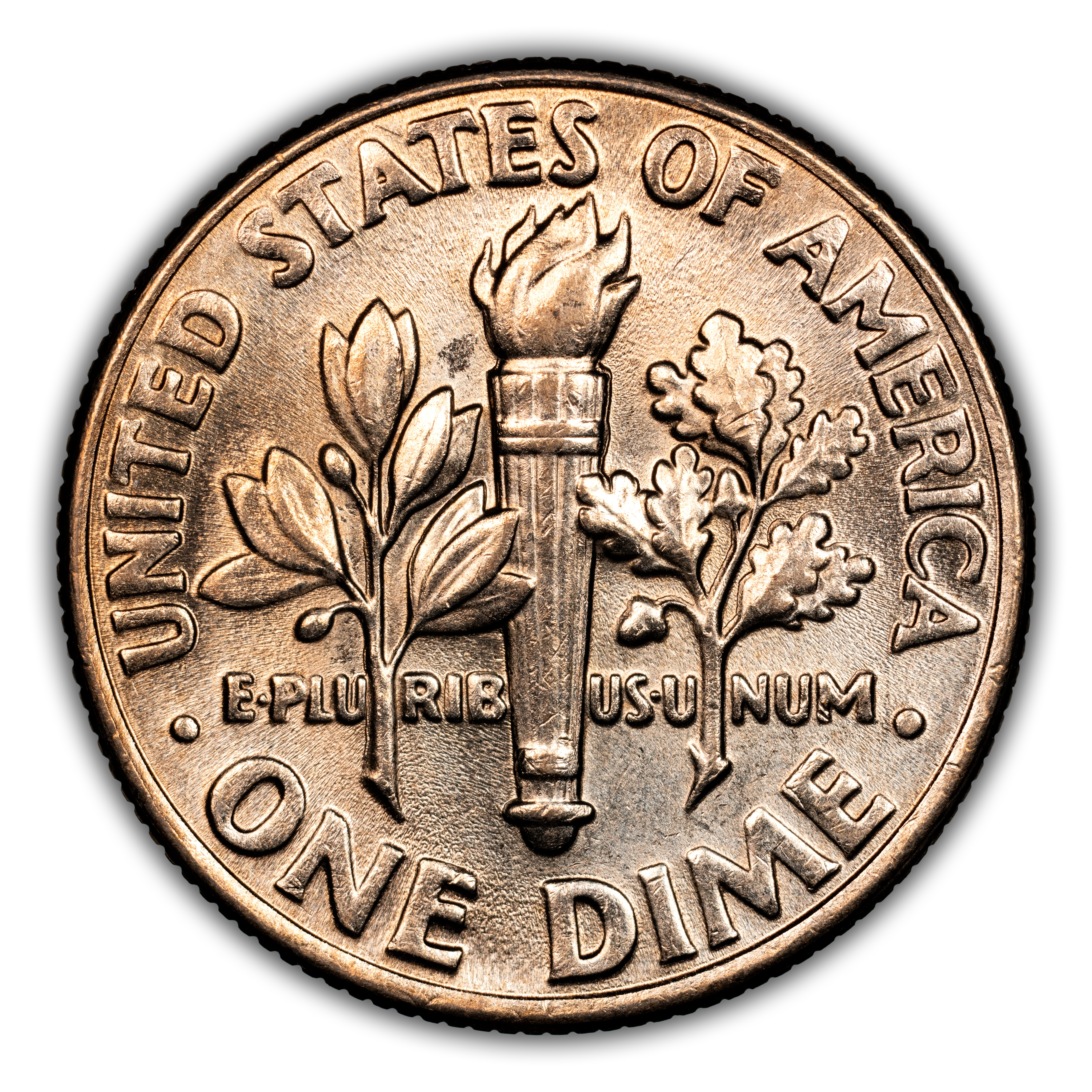 Reverse: Torch of Liberty is flanked by olive branches in the center with UNITED STATES OF AMERICA * ONE DIME around the circumference.