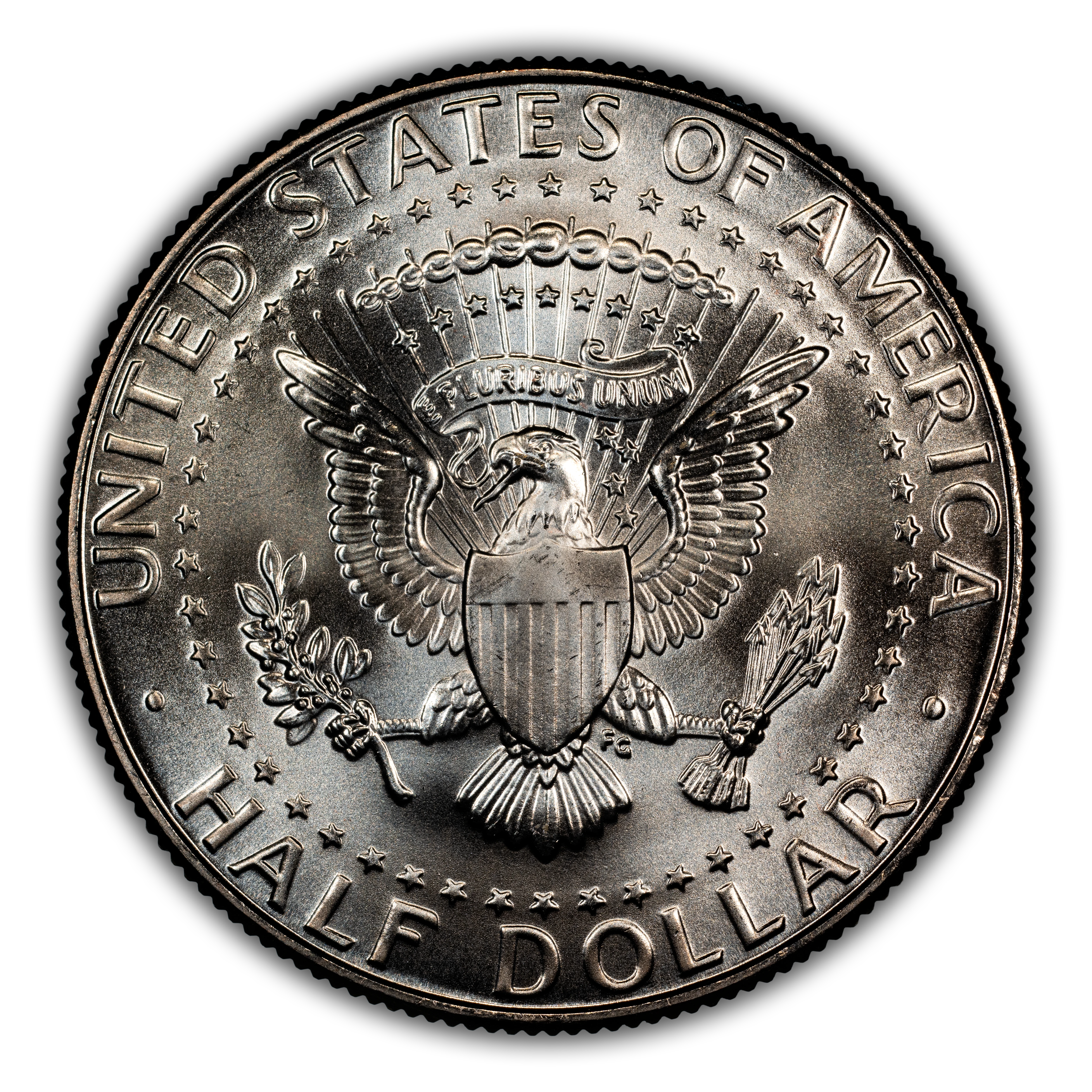 Reverse: The heraldic eagle holding arrows and branch of olive leaves with a full circle of stars around it. UNITED STATES OF AMERICA * HALF DOLLAR surround the periphery.