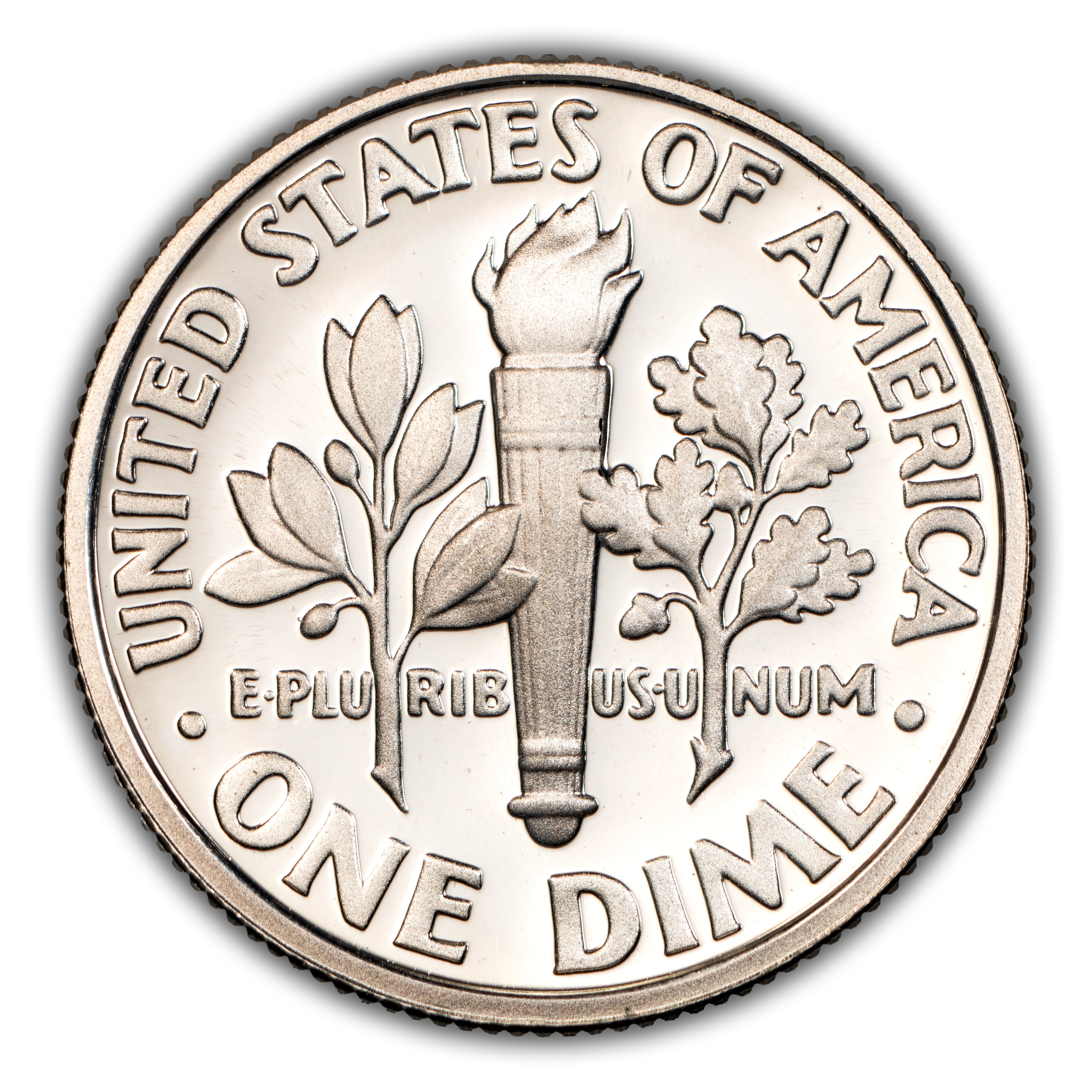 Reverse: Torch of Liberty is flanked by olive branches in the center with UNITED STATES OF AMERICA * ONE DIME around the circumference.