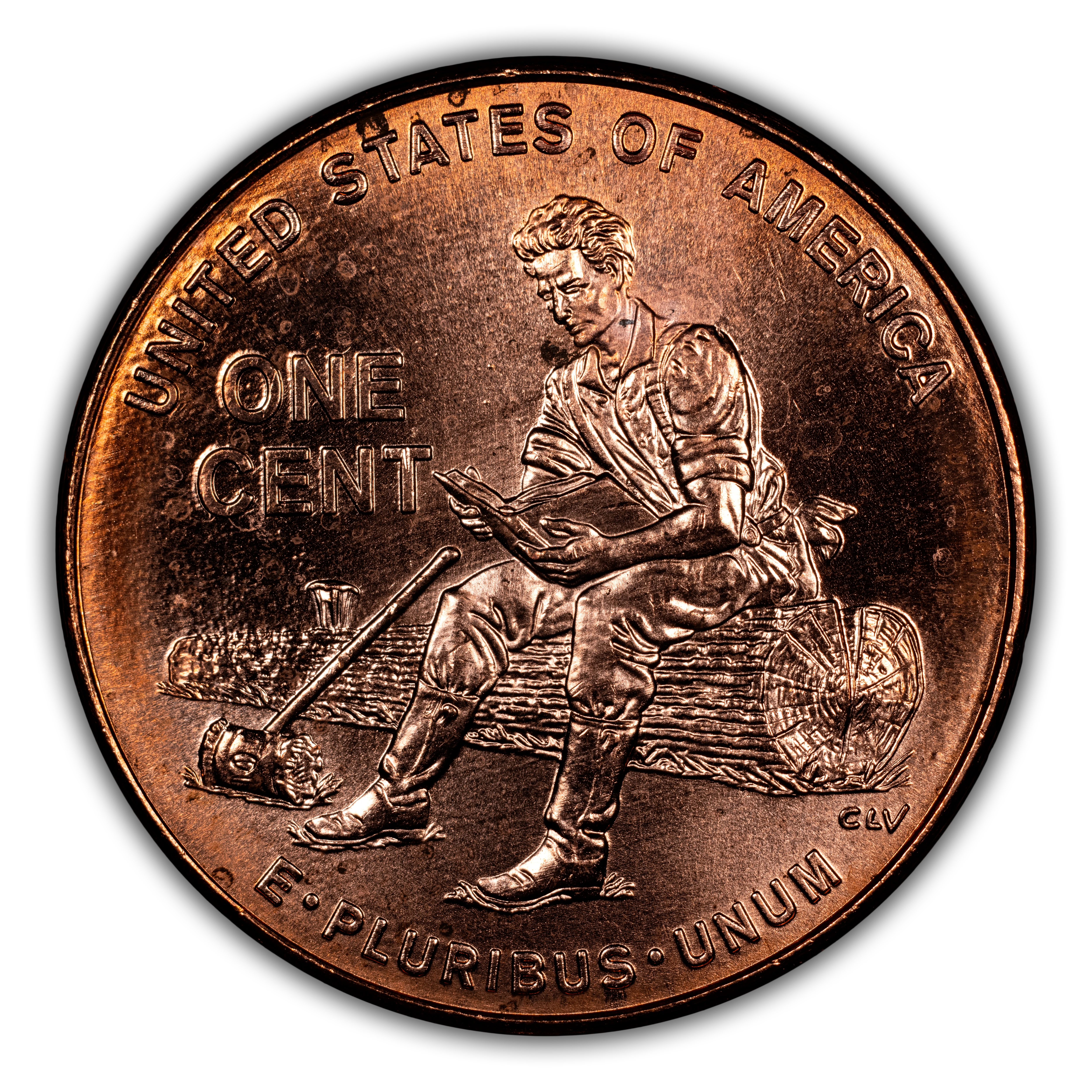 Reverse: Lincoln is portrayed sitting on a log reading a book, while taking a break from the laborious work of splitting work. Axe is resting nearby along with the words ONE CENT, UNITED STATES OF AMERICA, E PLURIBUS UNUM.