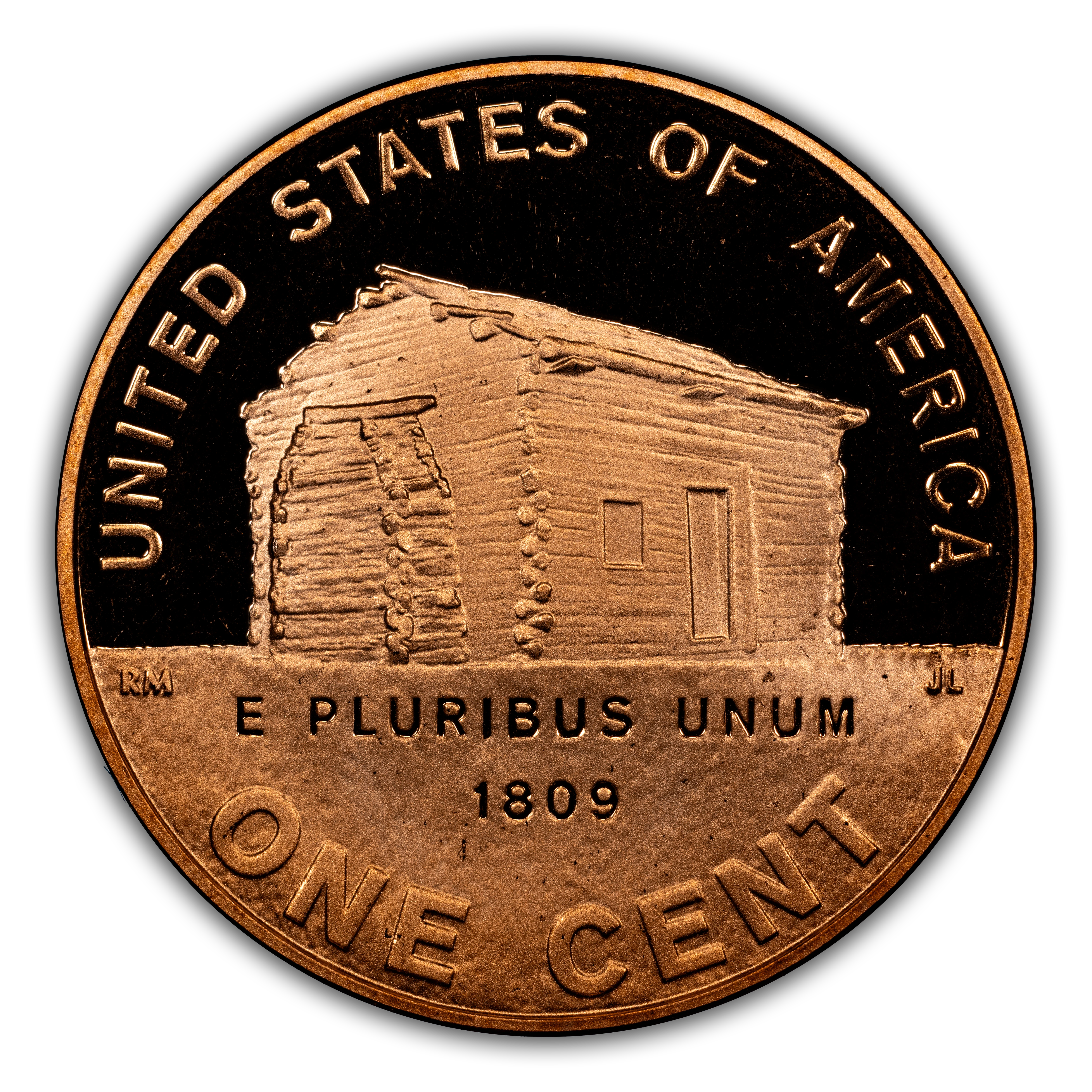 Reverse: Log cabin centered with words ONE CENT, UNITED STATES OF AMERICA on top and bottom periphery. E PLURIBUS UNUM centered below the cabin.