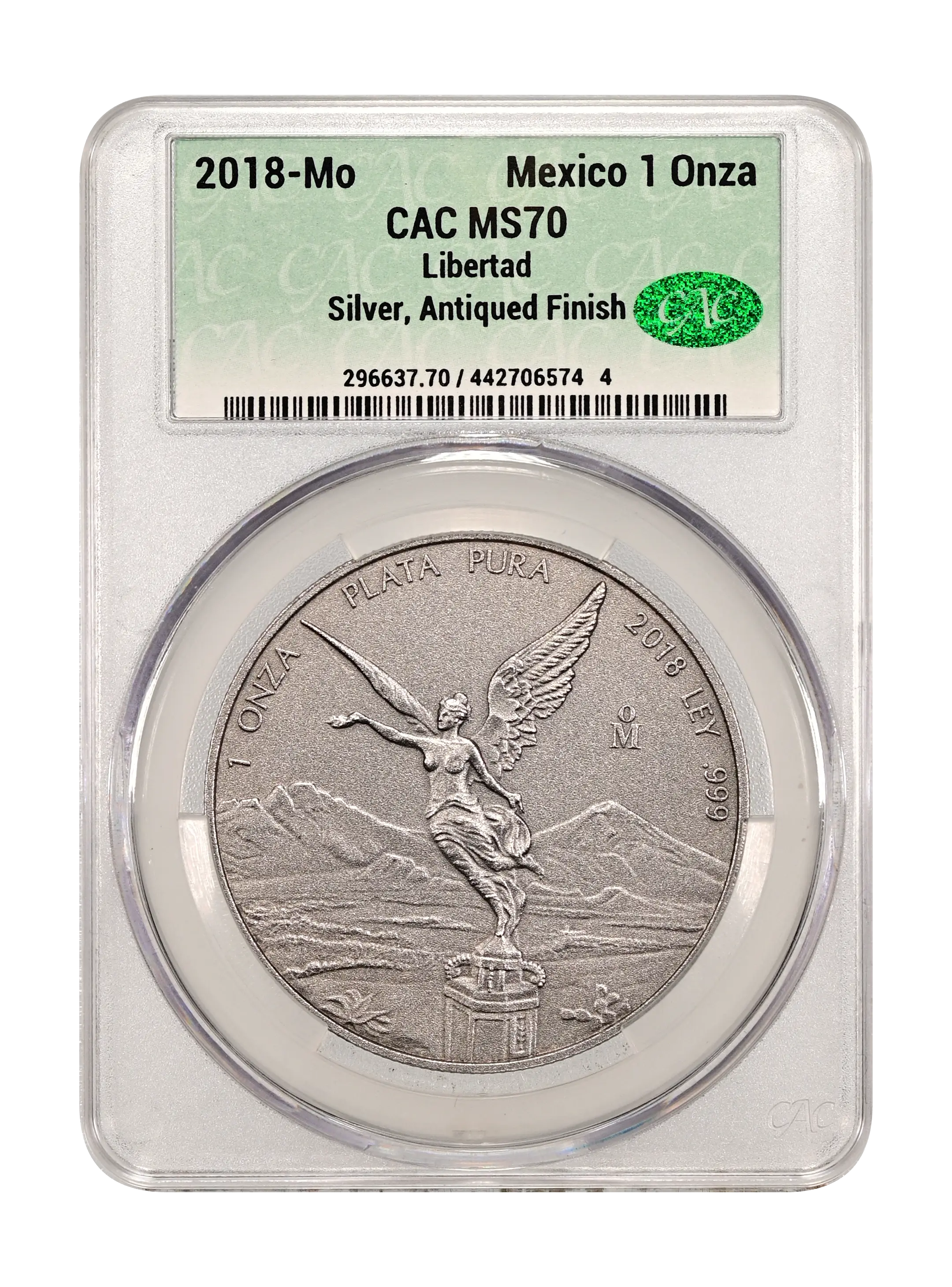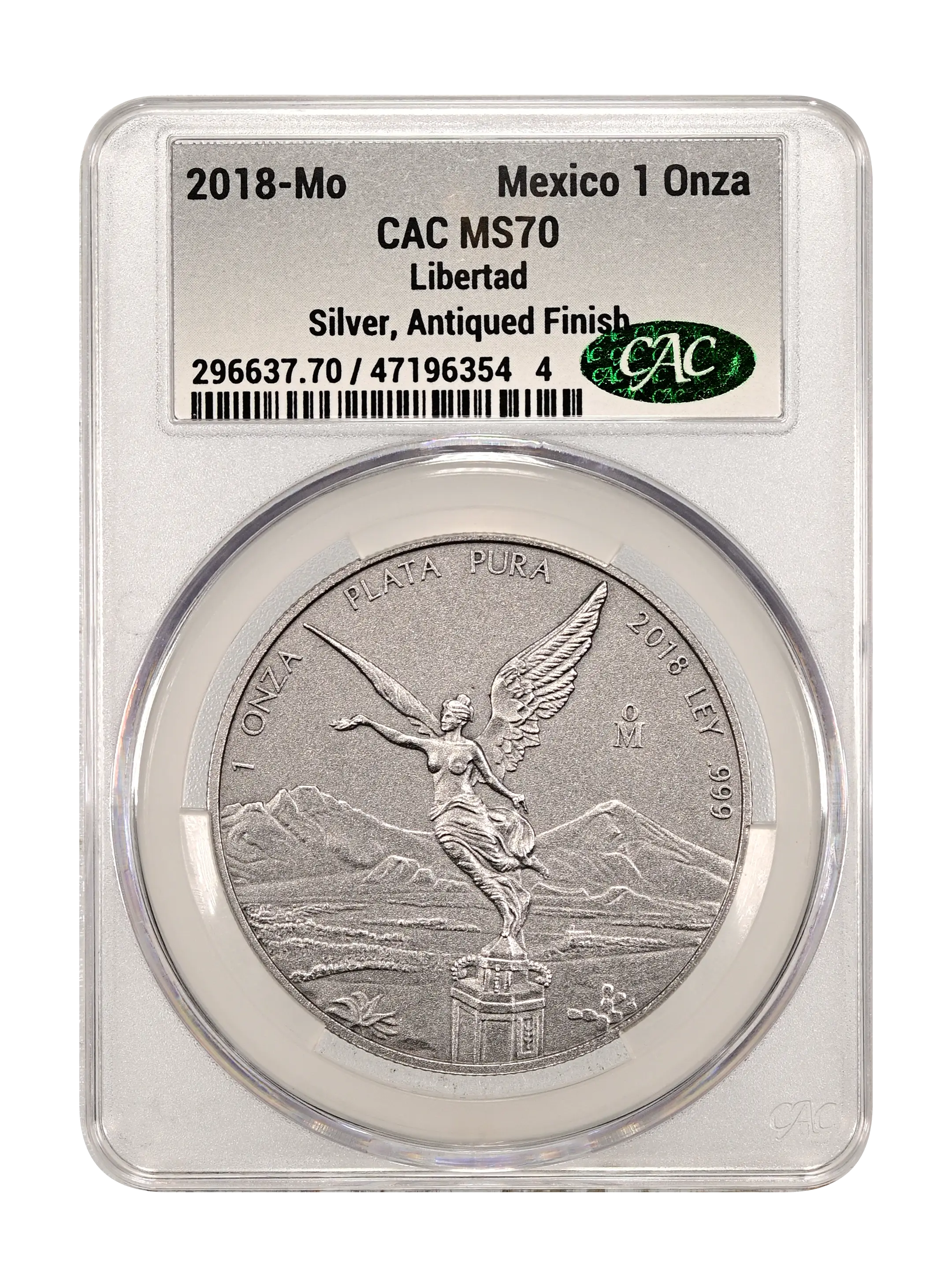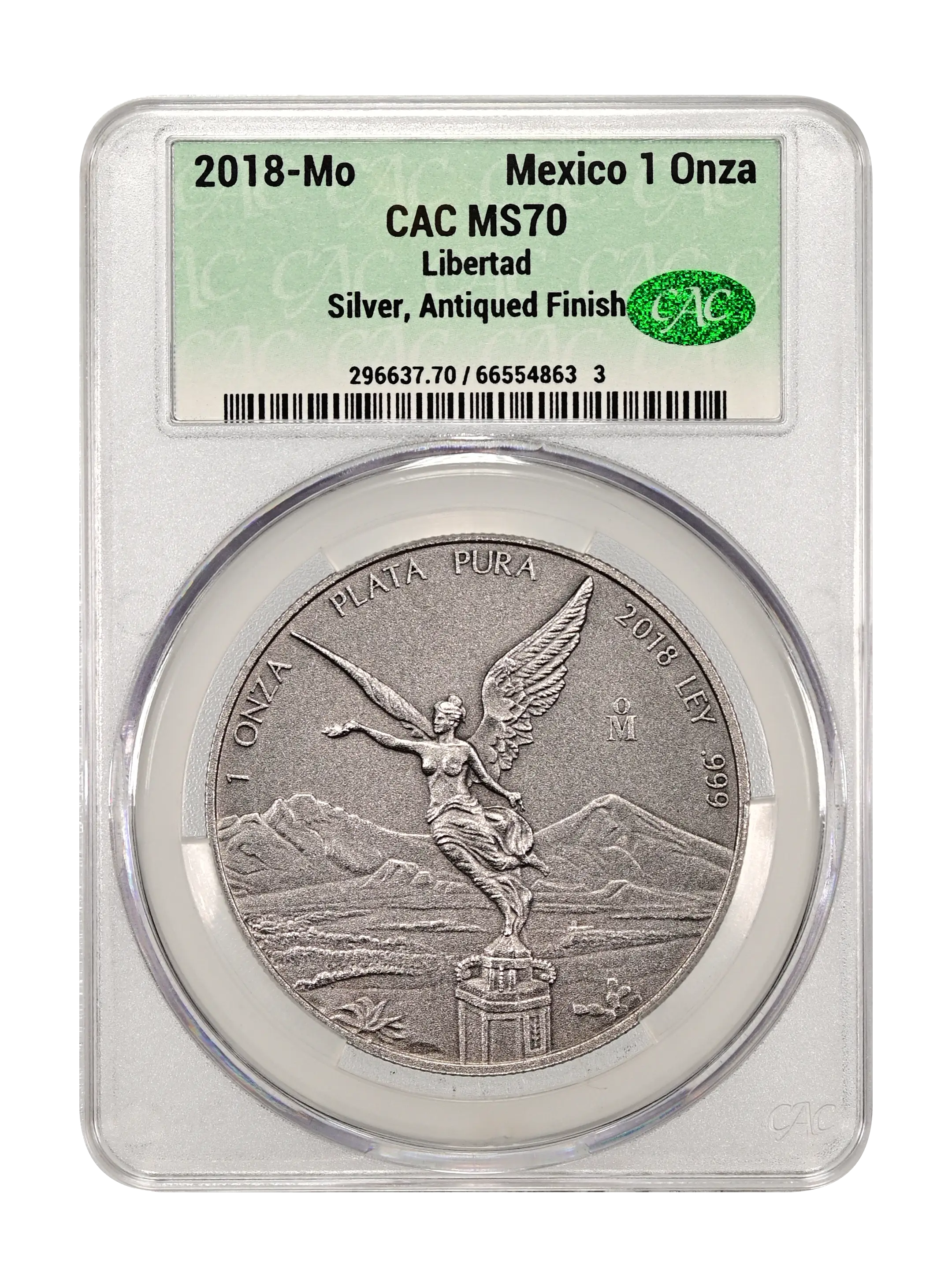 2018-Mo Libertad Mexico 1 Onza Silver, Antiqued Finish CAC MS70