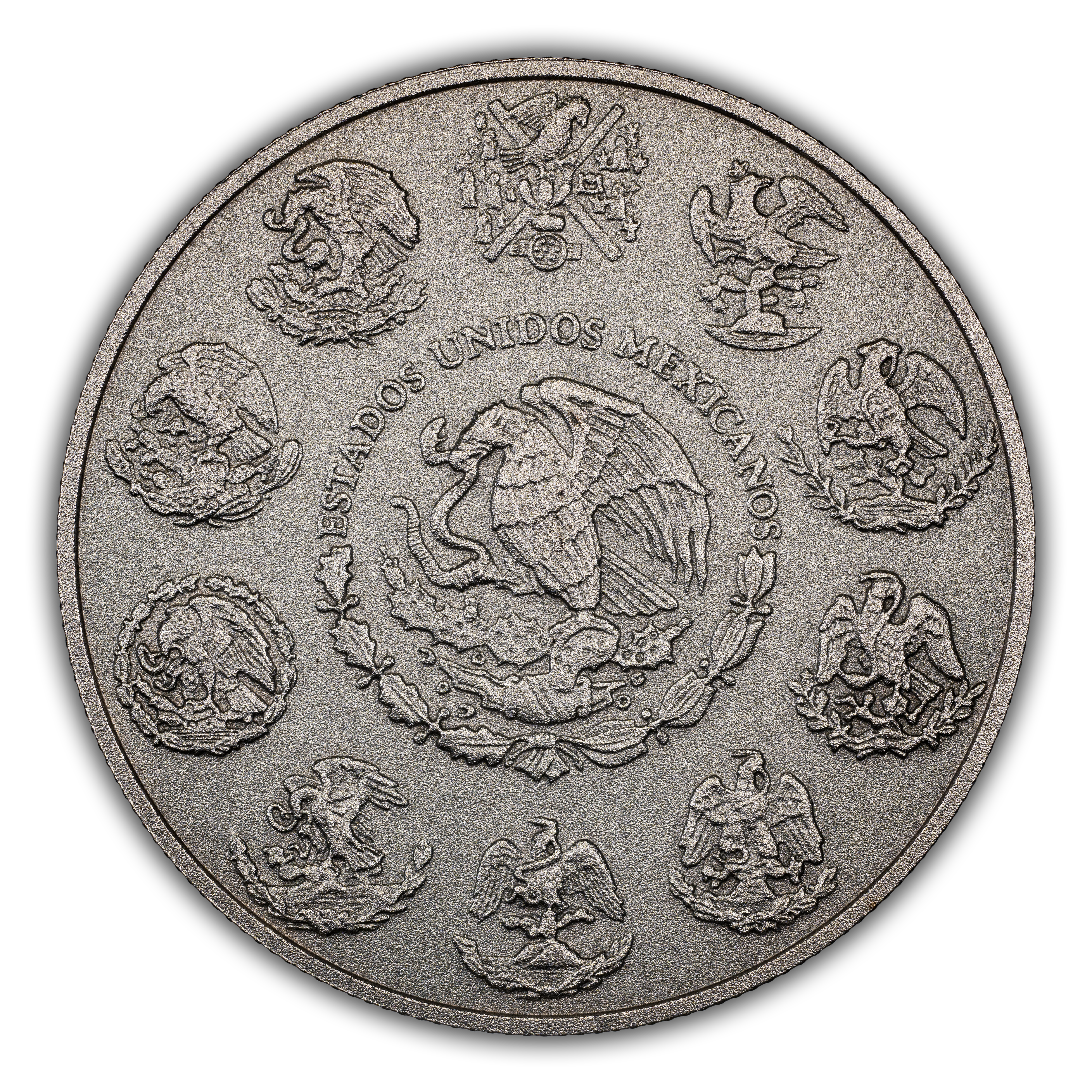 Reverse: Winged victory on a crowned pedestal, with the mountains and Mexico City in the background, with the weight at the top-left, metal at top-centre, date, mint, and fineness at top-right.