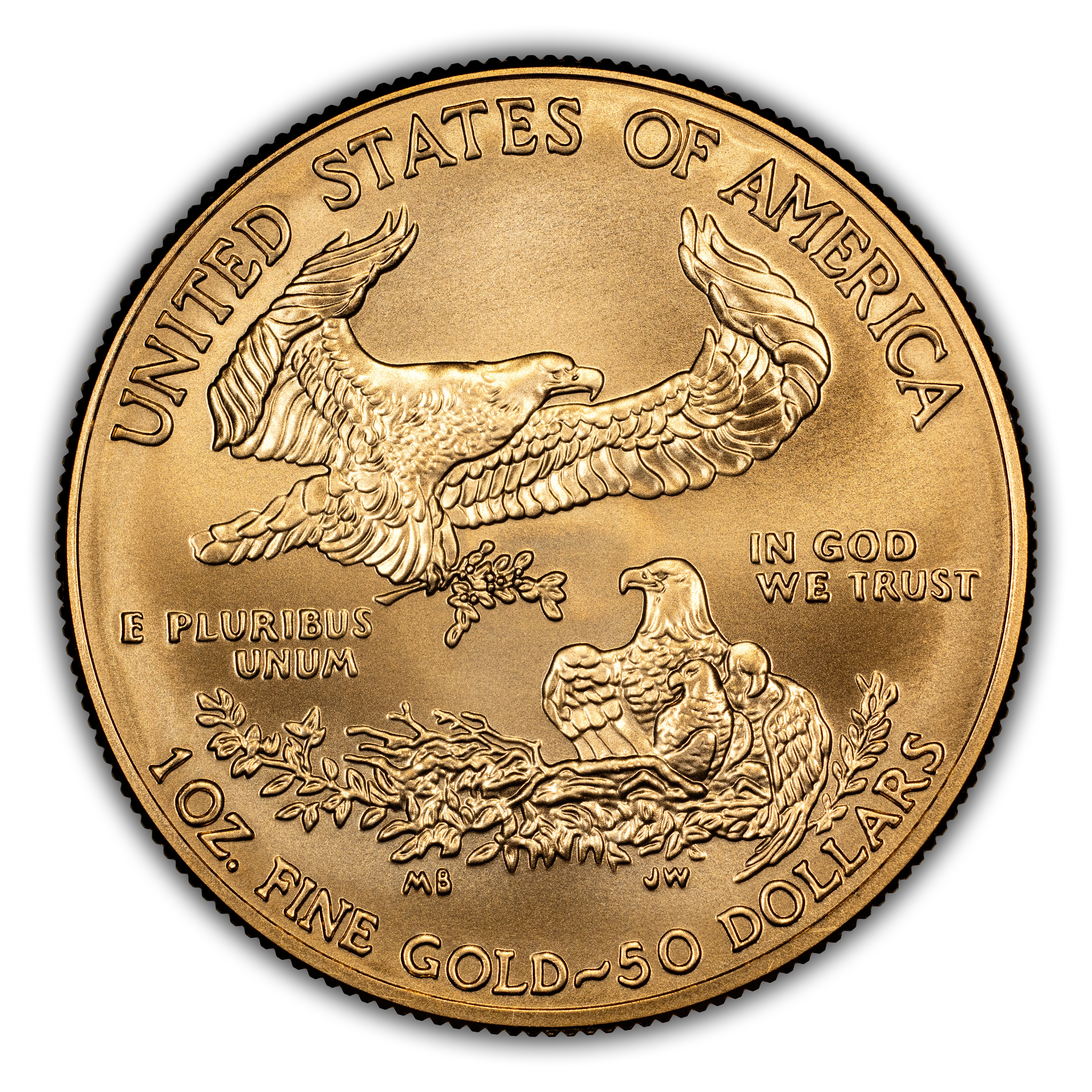Reverse: A flying eagle is depicted approaching her nest of three waiting eagles accompanied by the words UNITED STATES OF AMERICA, E PLURIBUS UNUM, IN GOD WE TRUST , 1 OZ. FINE GOLD~50 DOLLARS.