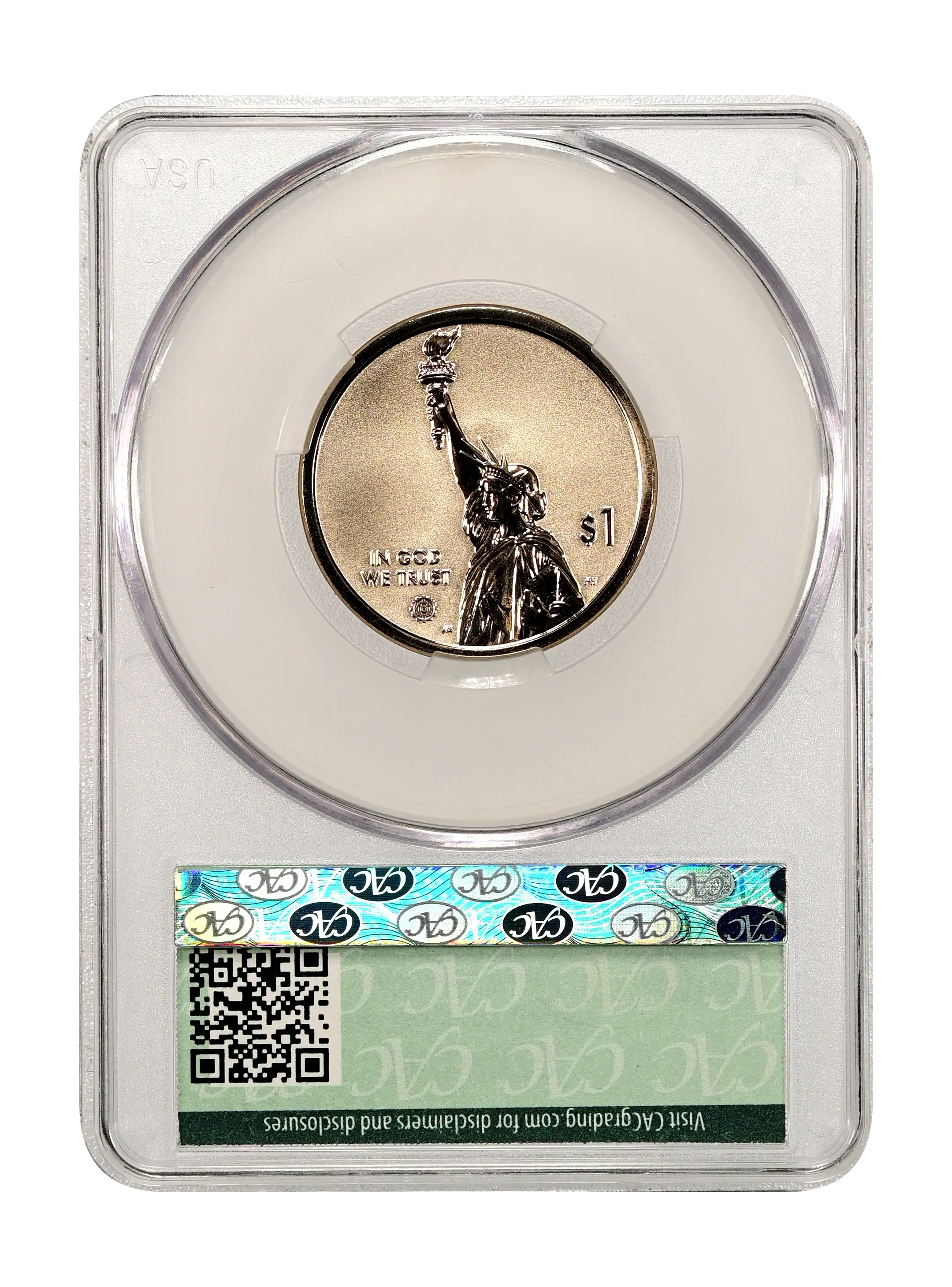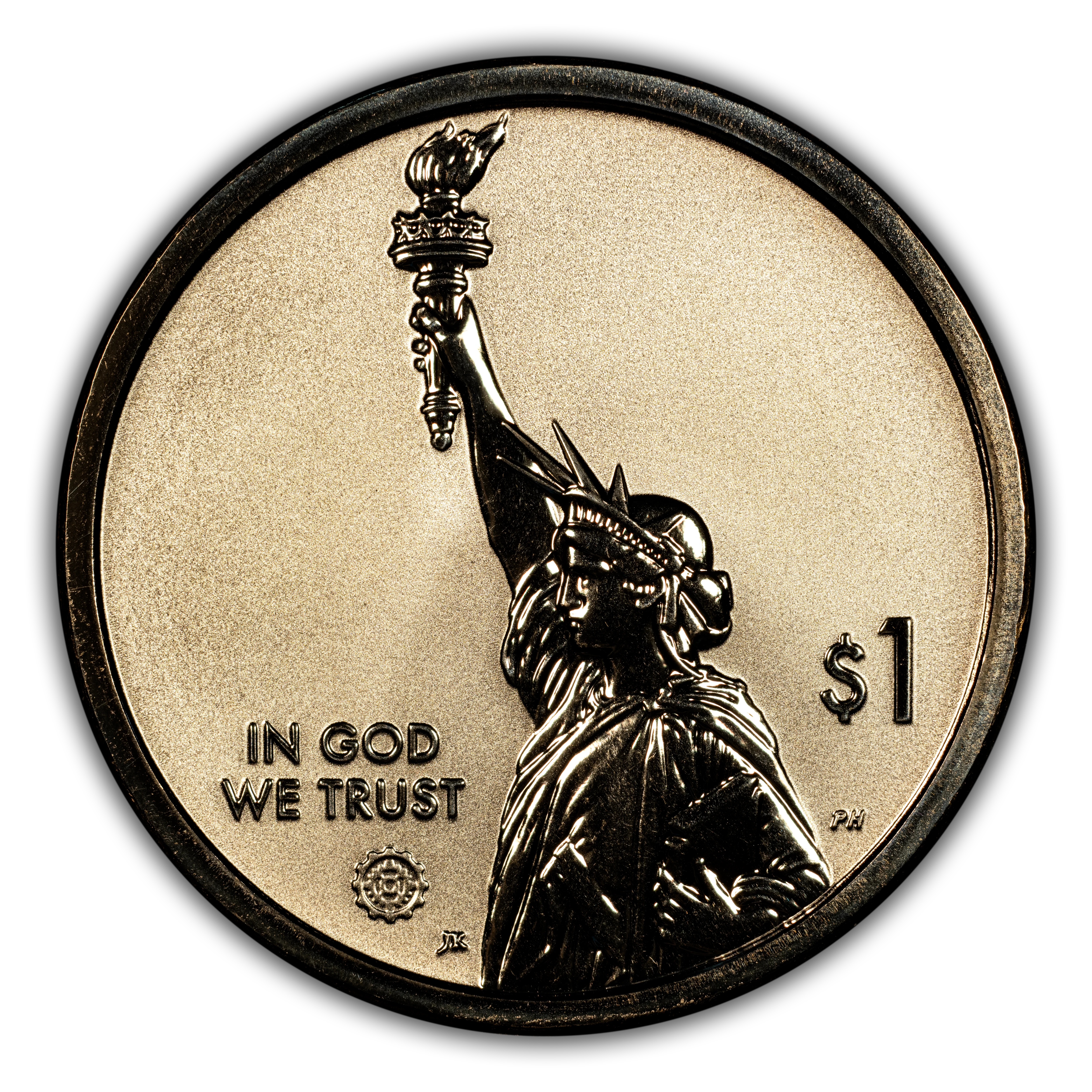 Obverse: The obverse (heads) design features a dramatic representation of the Statue of Liberty in profile with the inscriptions "IN GOD WE TRUST" and "$1." The obverse also includes a privy mark of a stylized gear, representing industry and innovation.