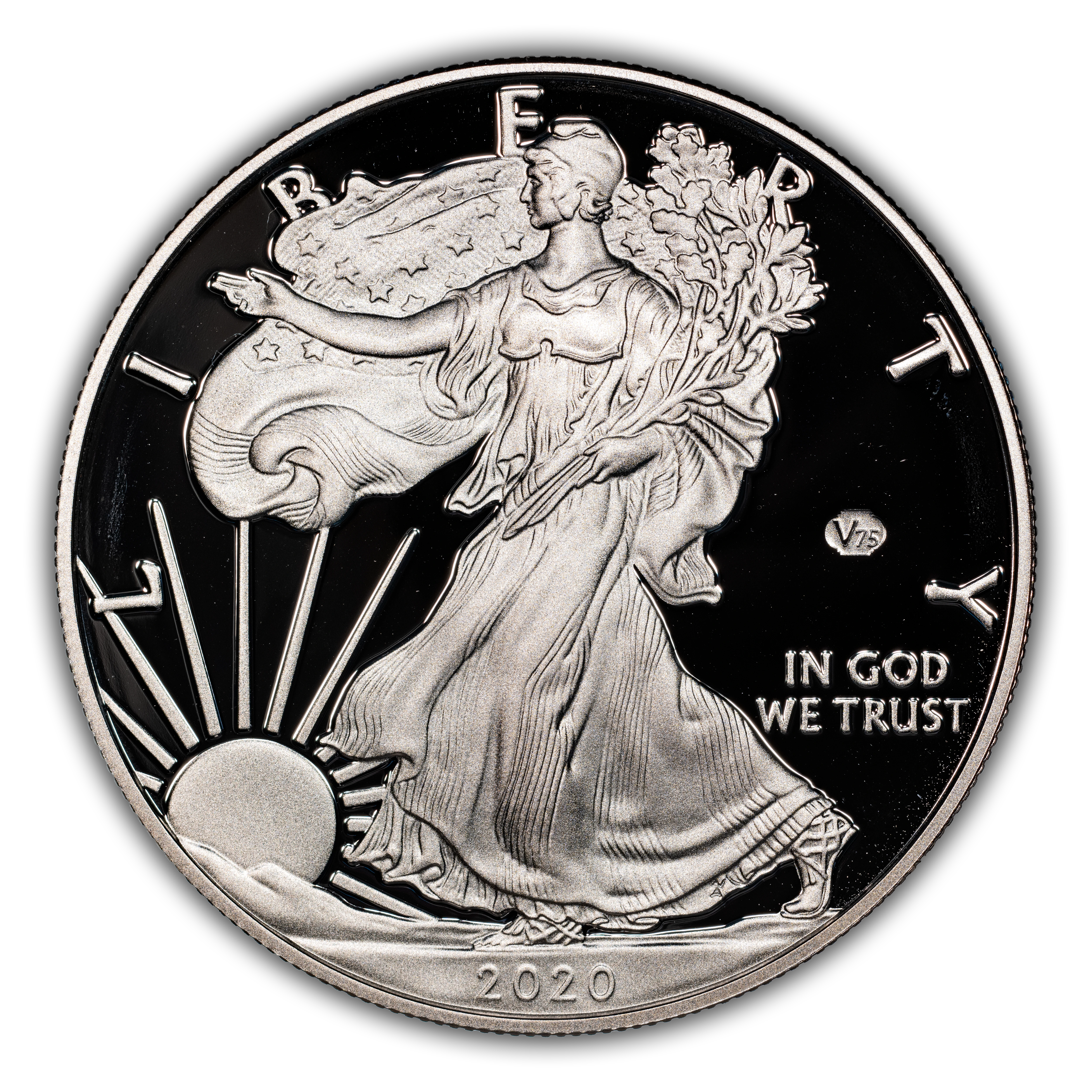 Obverse: The obverse design features a refreshed depiction of Adolph A. Weinman’s full-length figure of Liberty in full stride, enveloped in folds of the flag, with her right hand extended and branches of laurel and oak in her left.