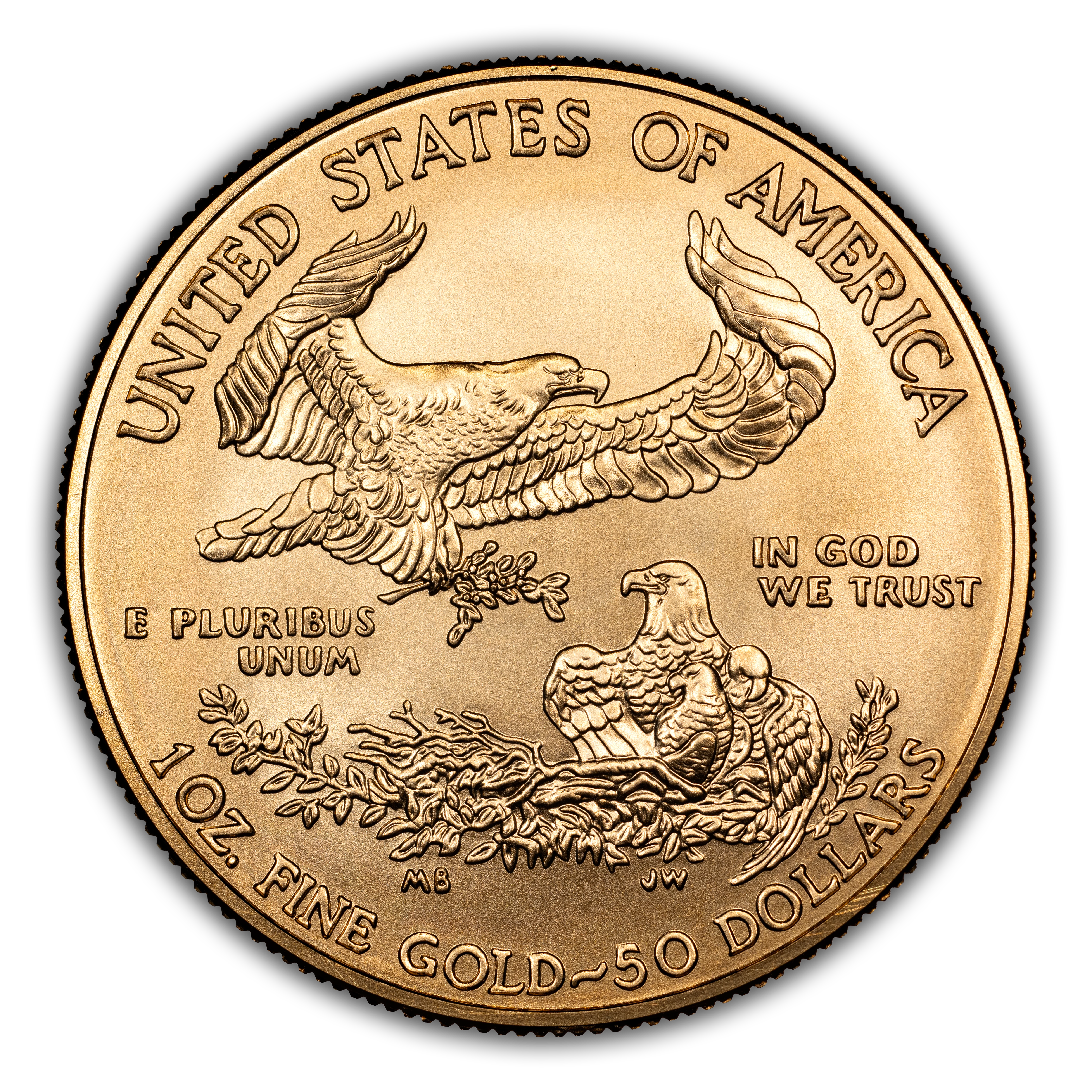 Reverse: A flying eagle is depicted approaching her nest of three waiting eagles accompanied by the words UNITED STATES OF AMERICA, E PLURIBUS UNUM, IN GOD WE TRUST , 1 OZ. FINE GOLD~50 DOLLARS.