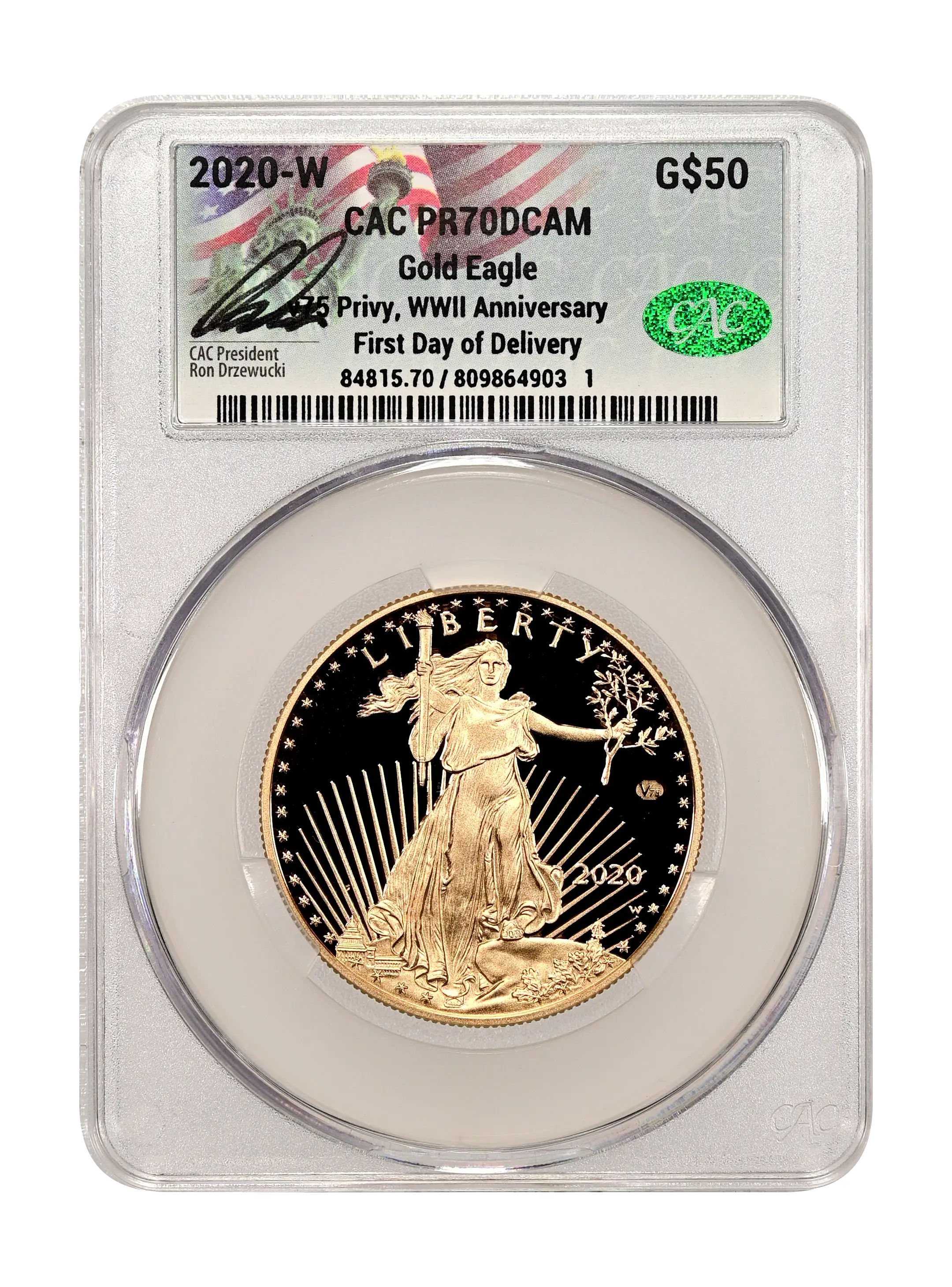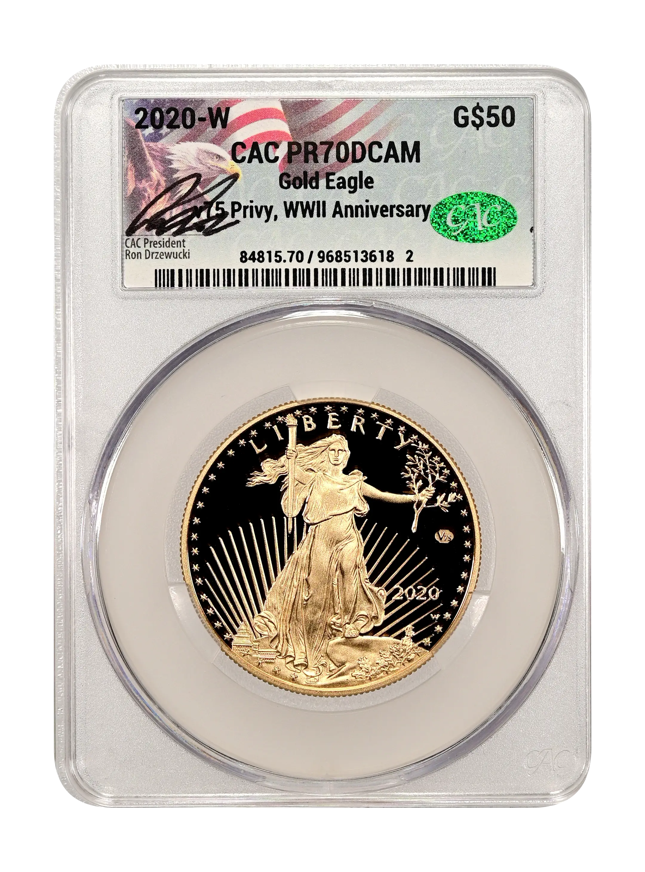 2020-W Gold Eagle G$50 v75 Privy, WWII Anniversary DCAM (Proof) CAC PR70UCAM