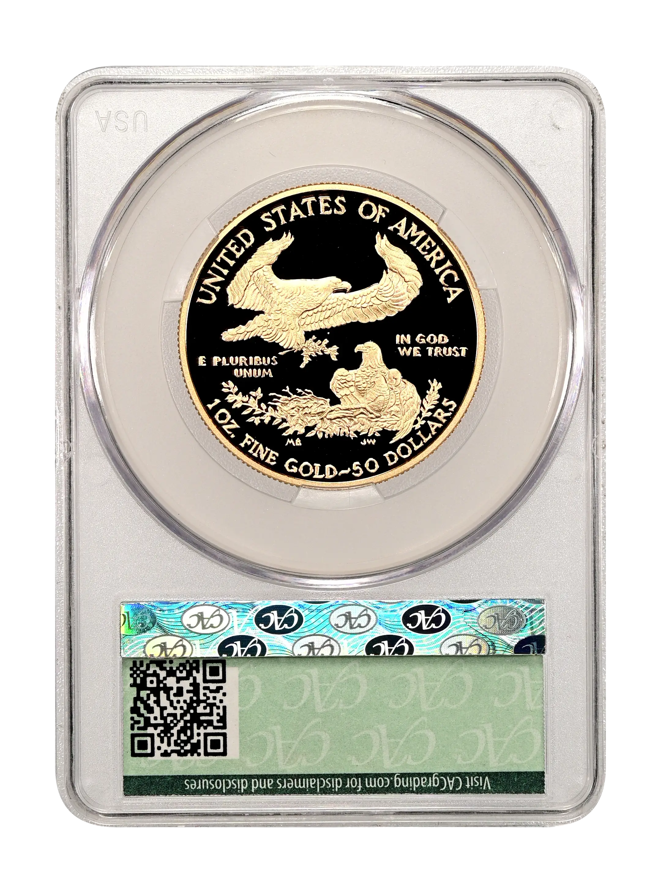 Reverse: A flying eagle is depicted approaching her nest of three waiting eagles accompanied by the words UNITED STATES OF AMERICA, E PLURIBUS UNUM, IN GOD WE TRUST , 1 OZ. FINE GOLD~50 DOLLARS.