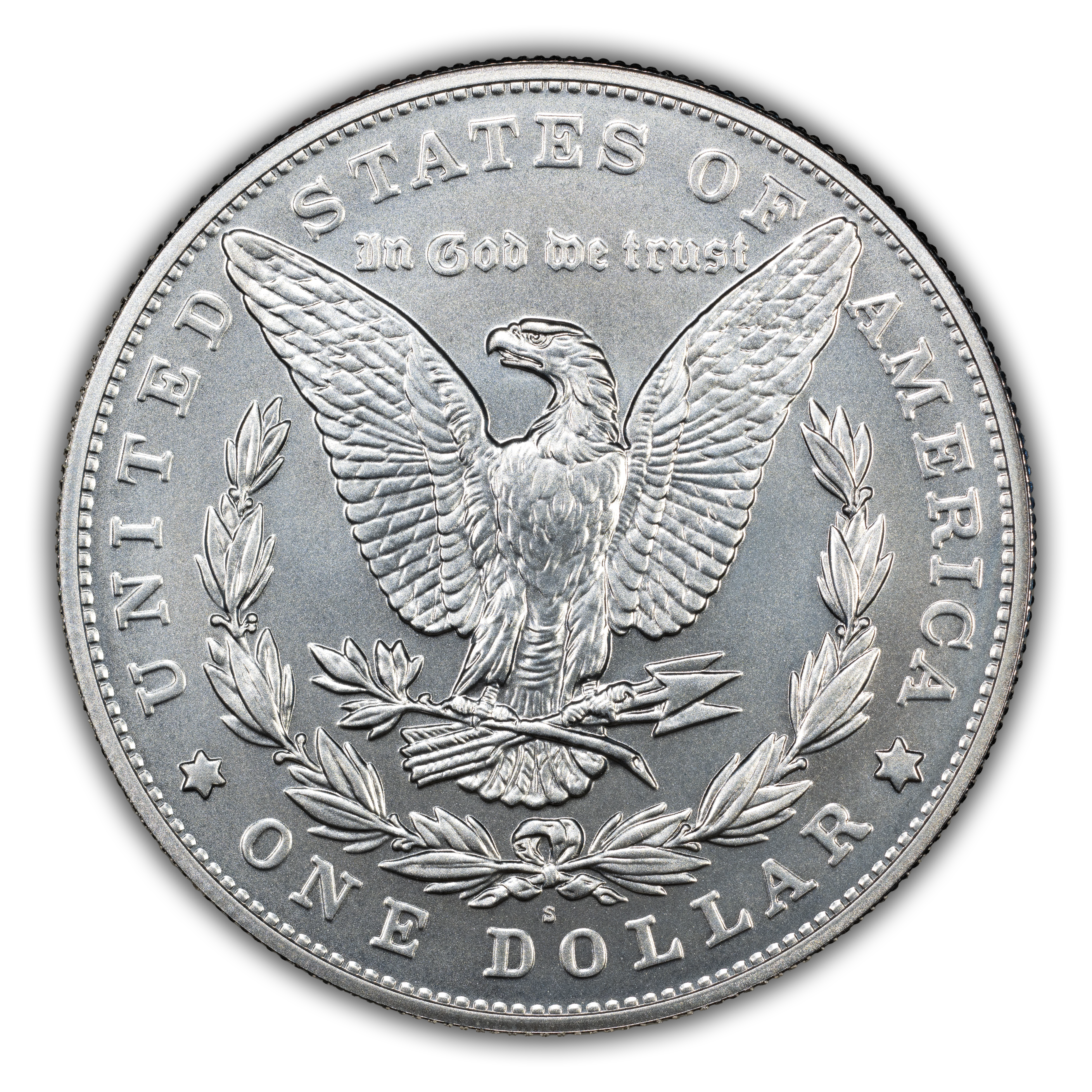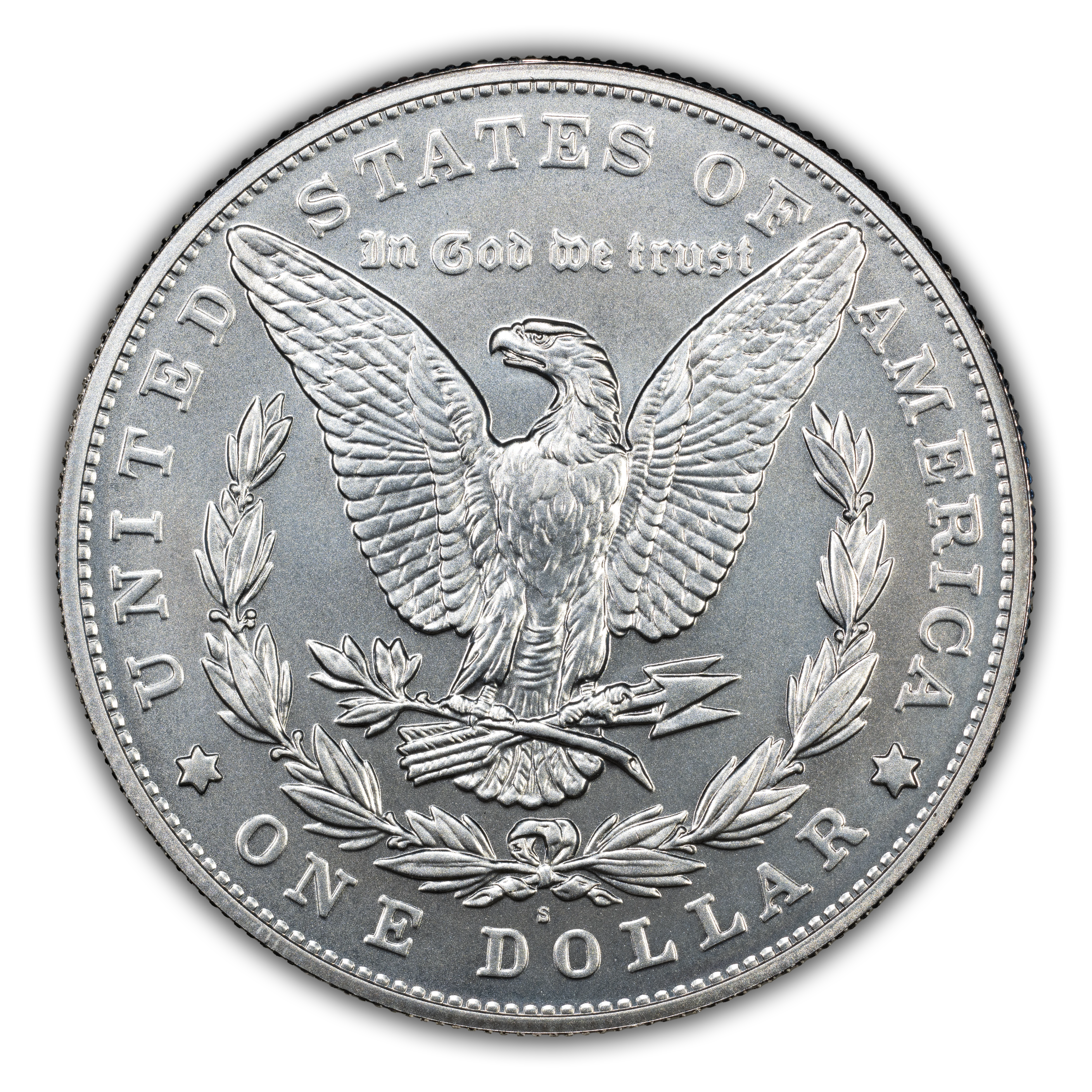 Reverse: The reverse depicts an eagle with outstretched wings clasping arrows and an olive branch, accompanied by a wreath. Reverse inscriptions are "UNITED STATES OF AMERICA," "IN GOD WE TRUST," and "ONE DOLLAR."