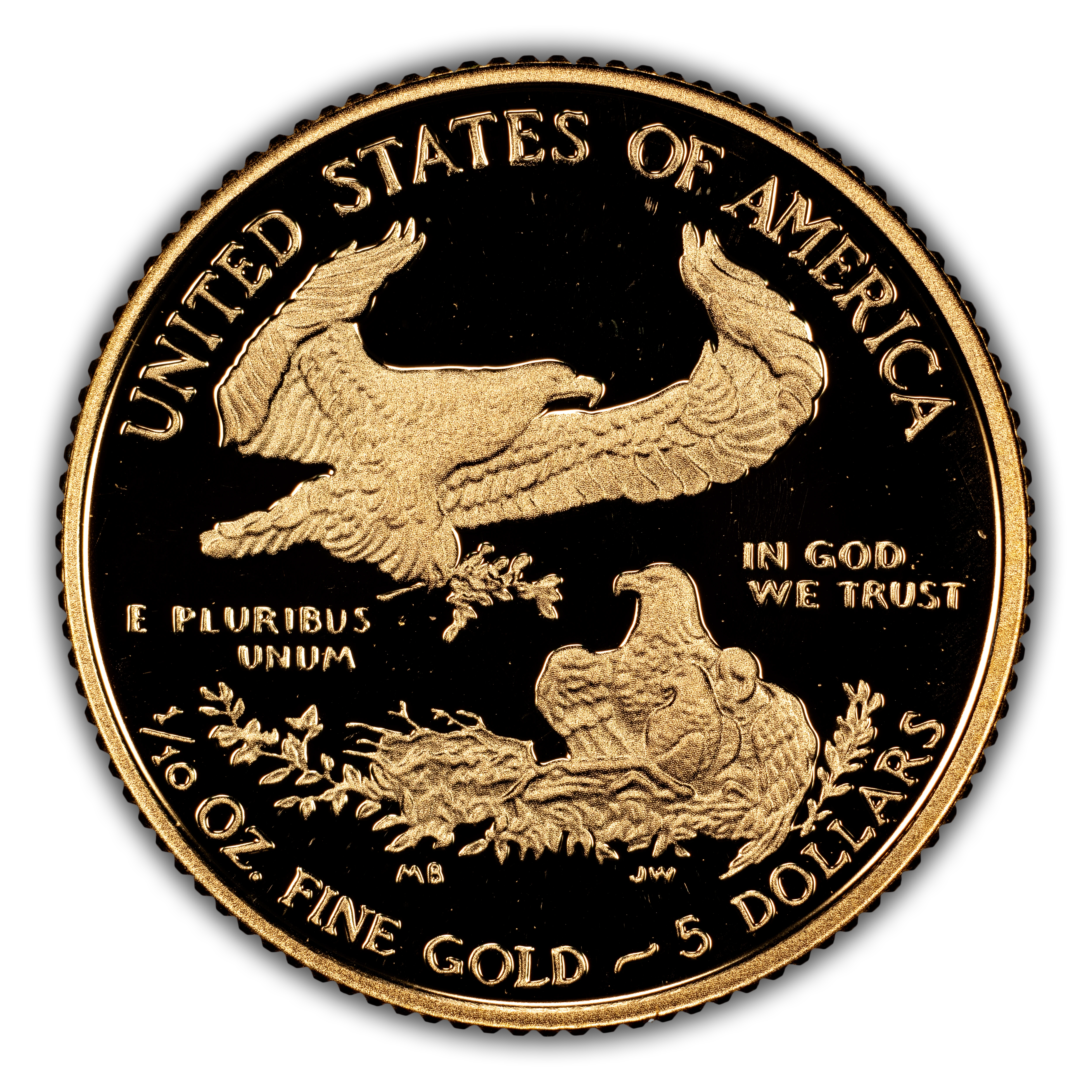 Reverse: A flying eagle is depicted approaching her nest of three waiting eagles accompanied by the words UNITED STATES OF AMERICA, E PLURIBUS UNUM, IN GOD WE TRUST , 1/10 OZ. FINE GOLD~5 DOLLARS.