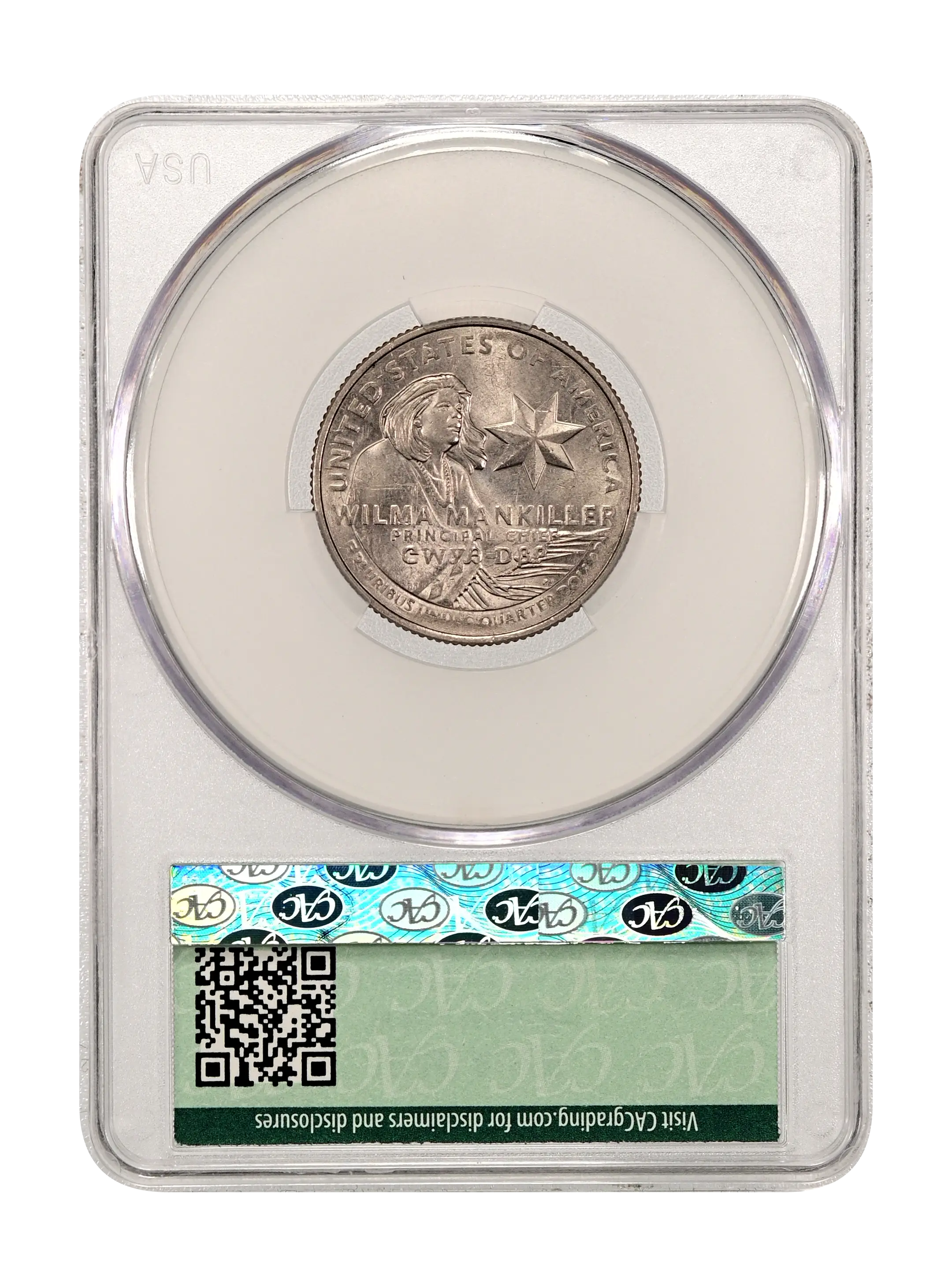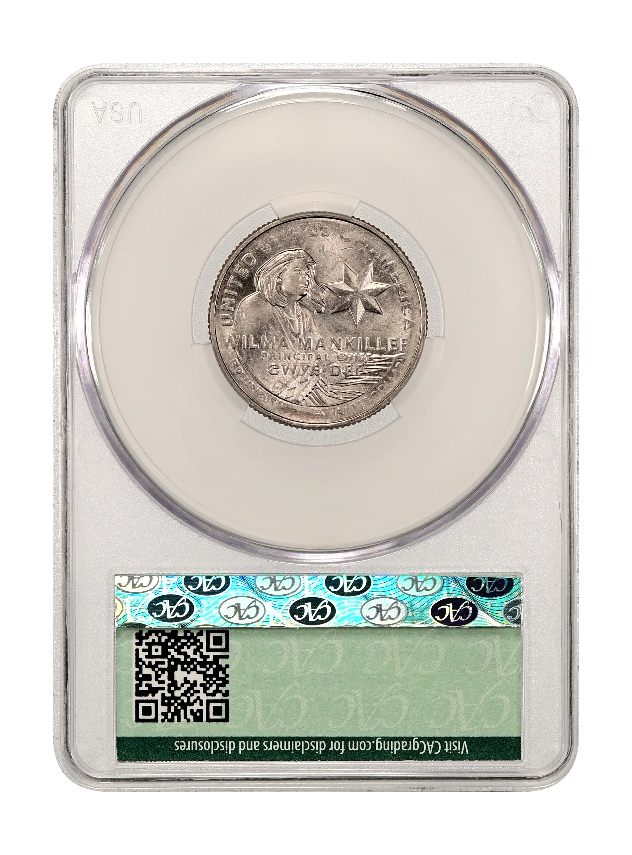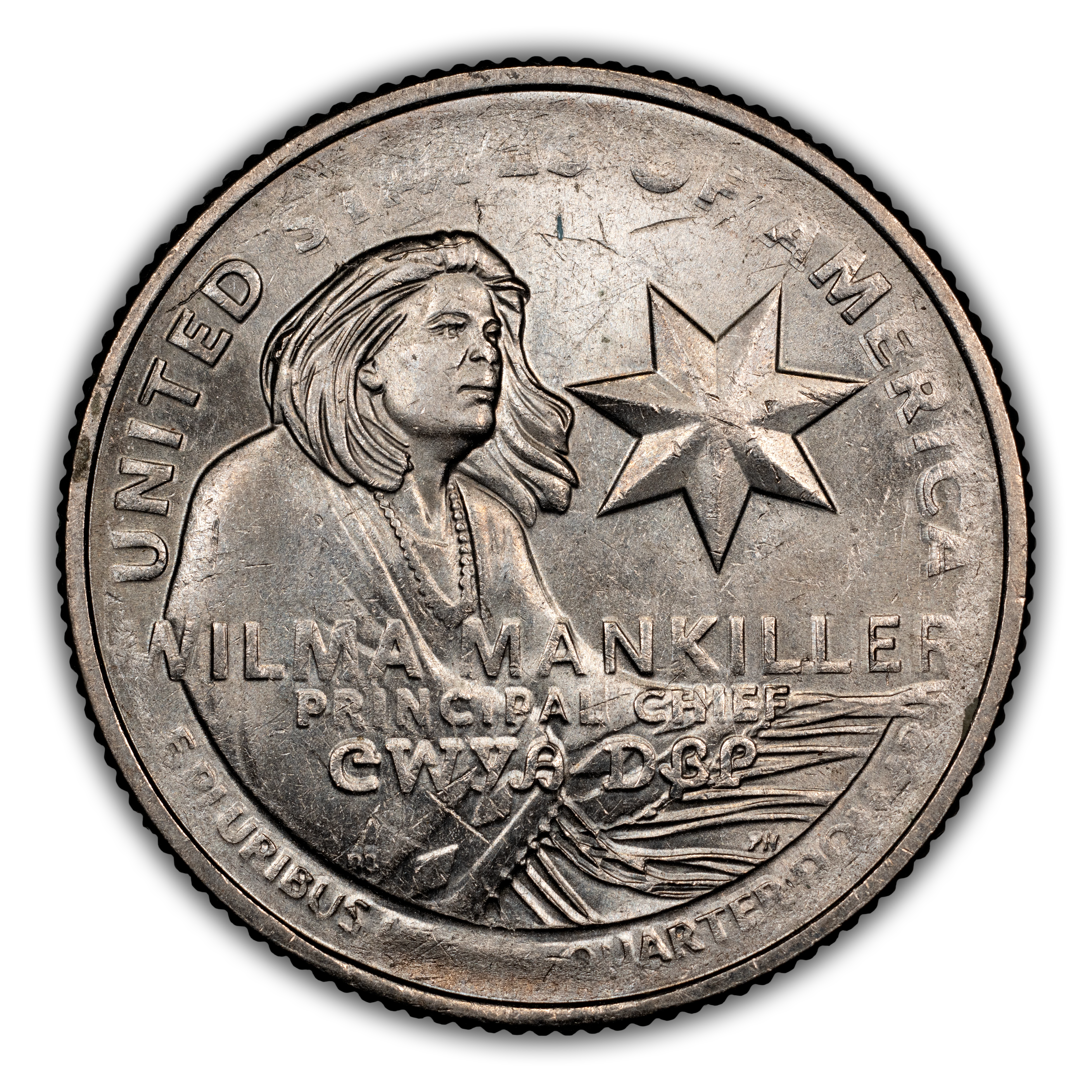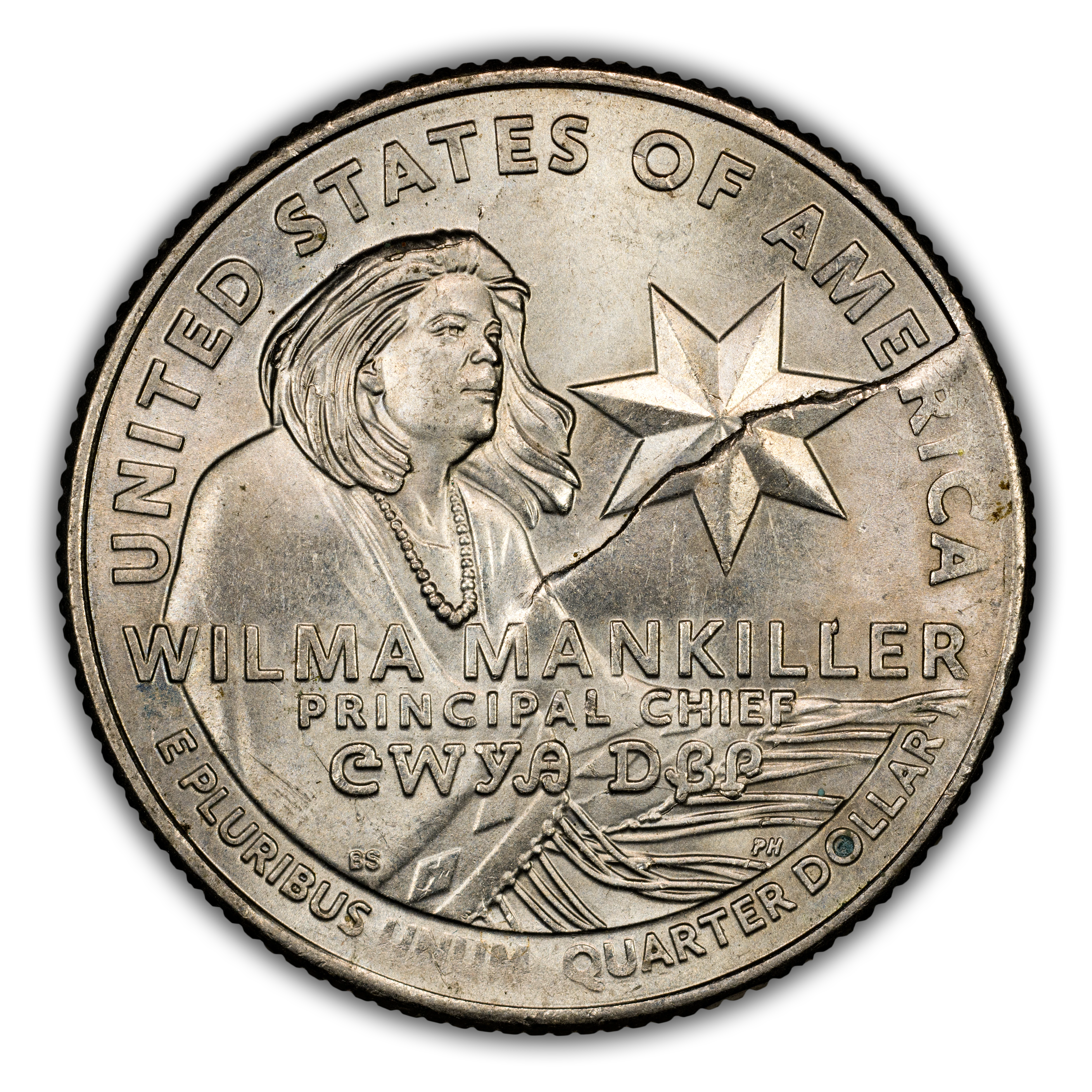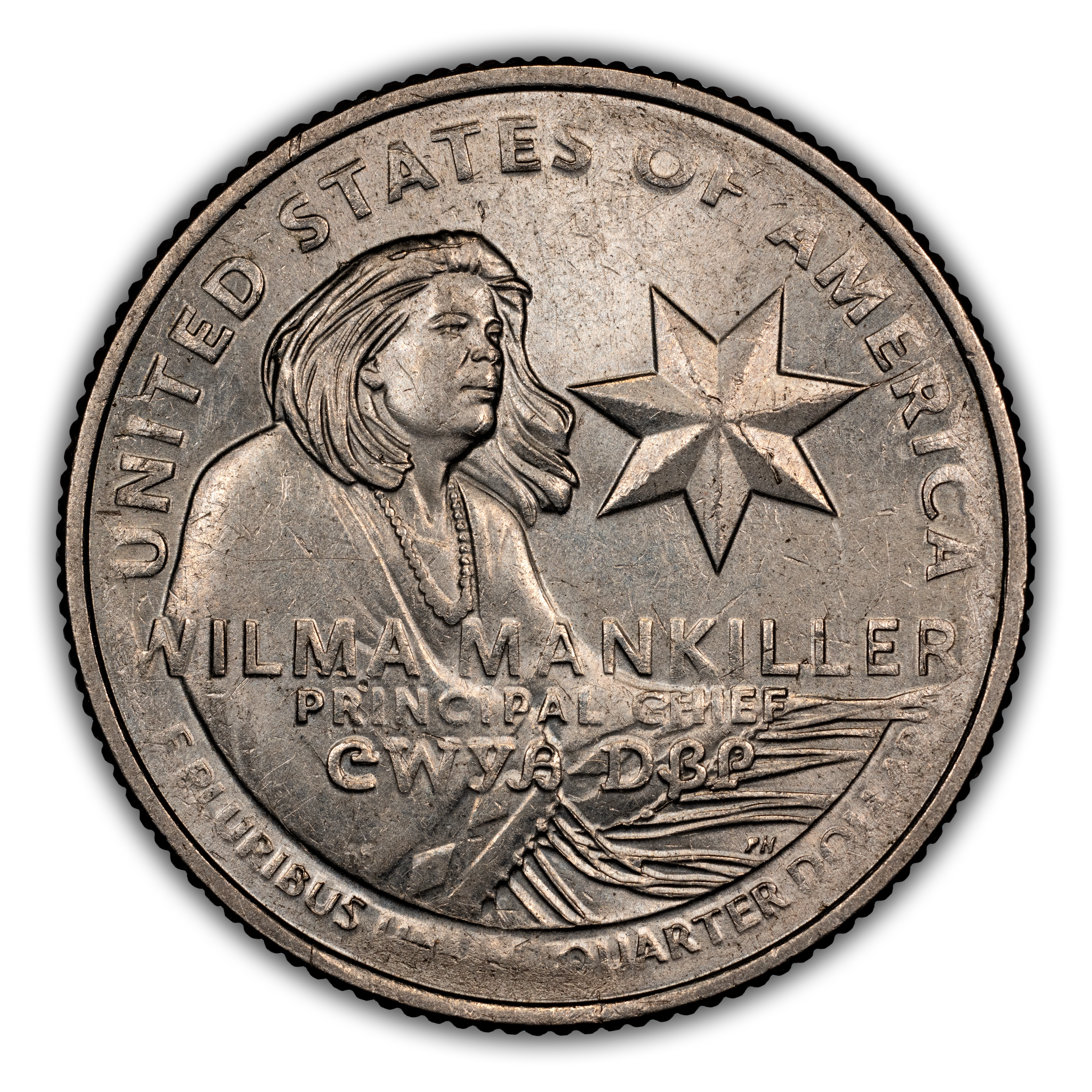 Reverse: The reverse (tails) depicts Wilma Mankiller with a resolute gaze to the future. The wind is at her back, and she is wrapped in a traditional shawl. To her left is the seven-pointed star of the Cherokee Nation.