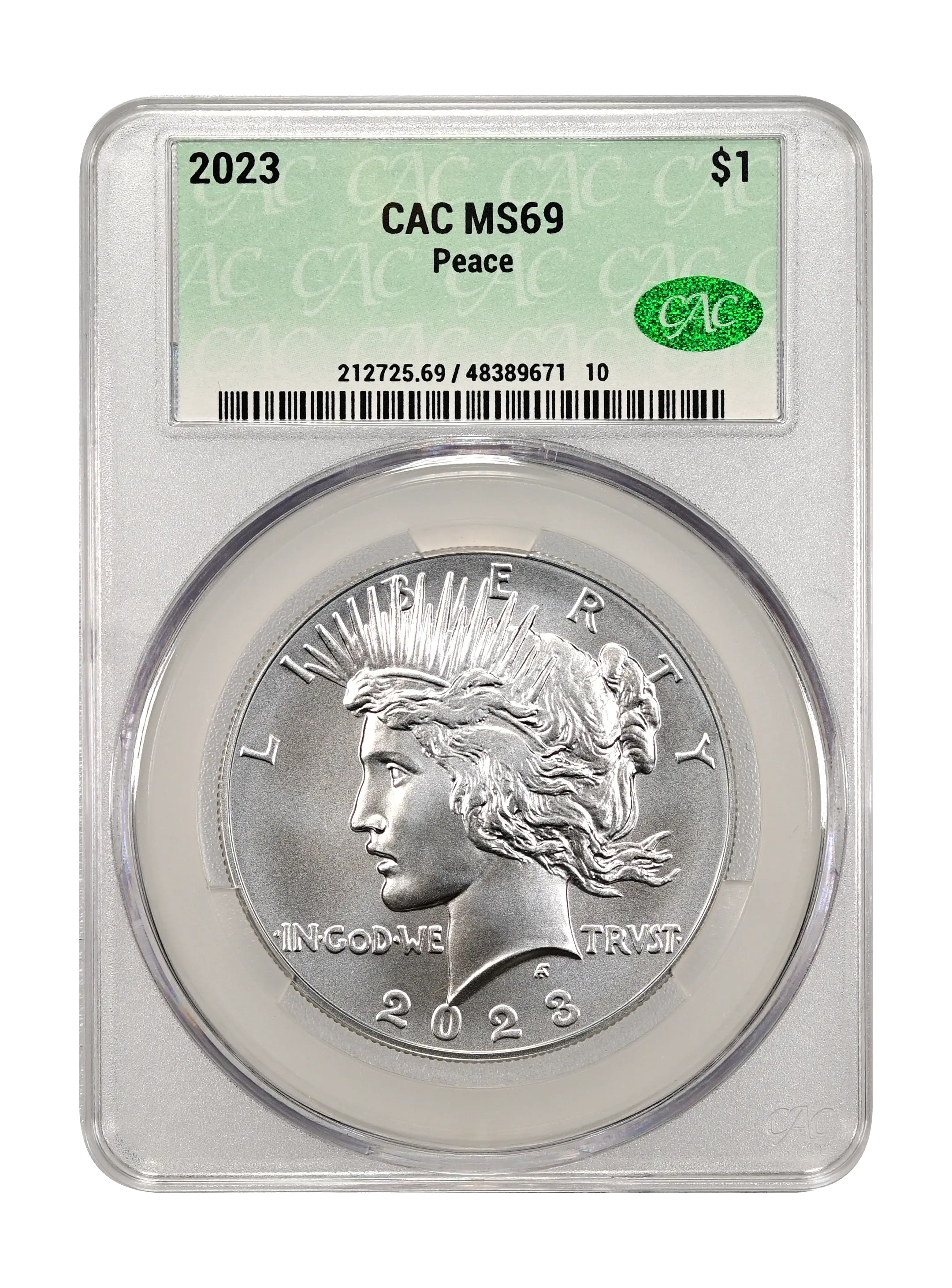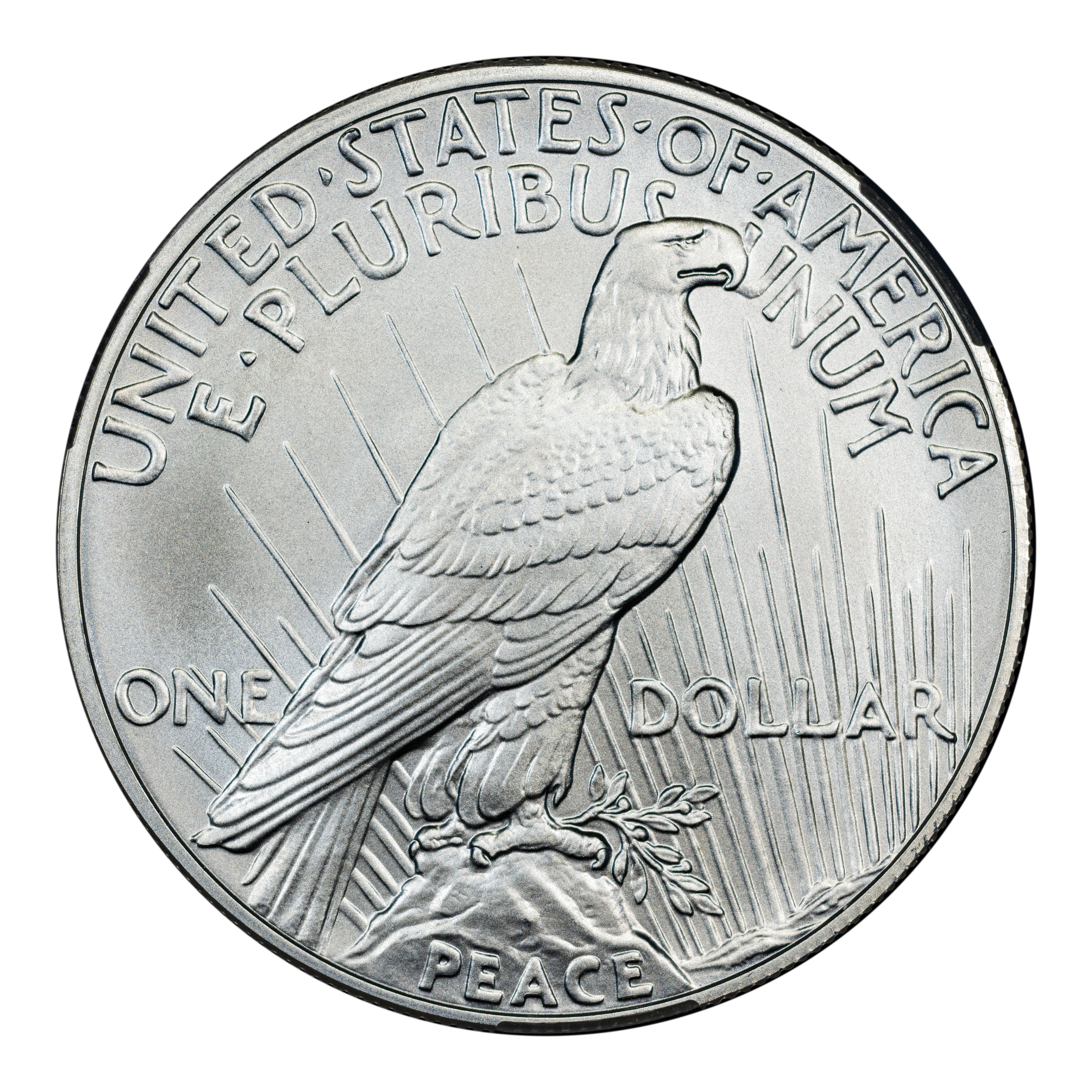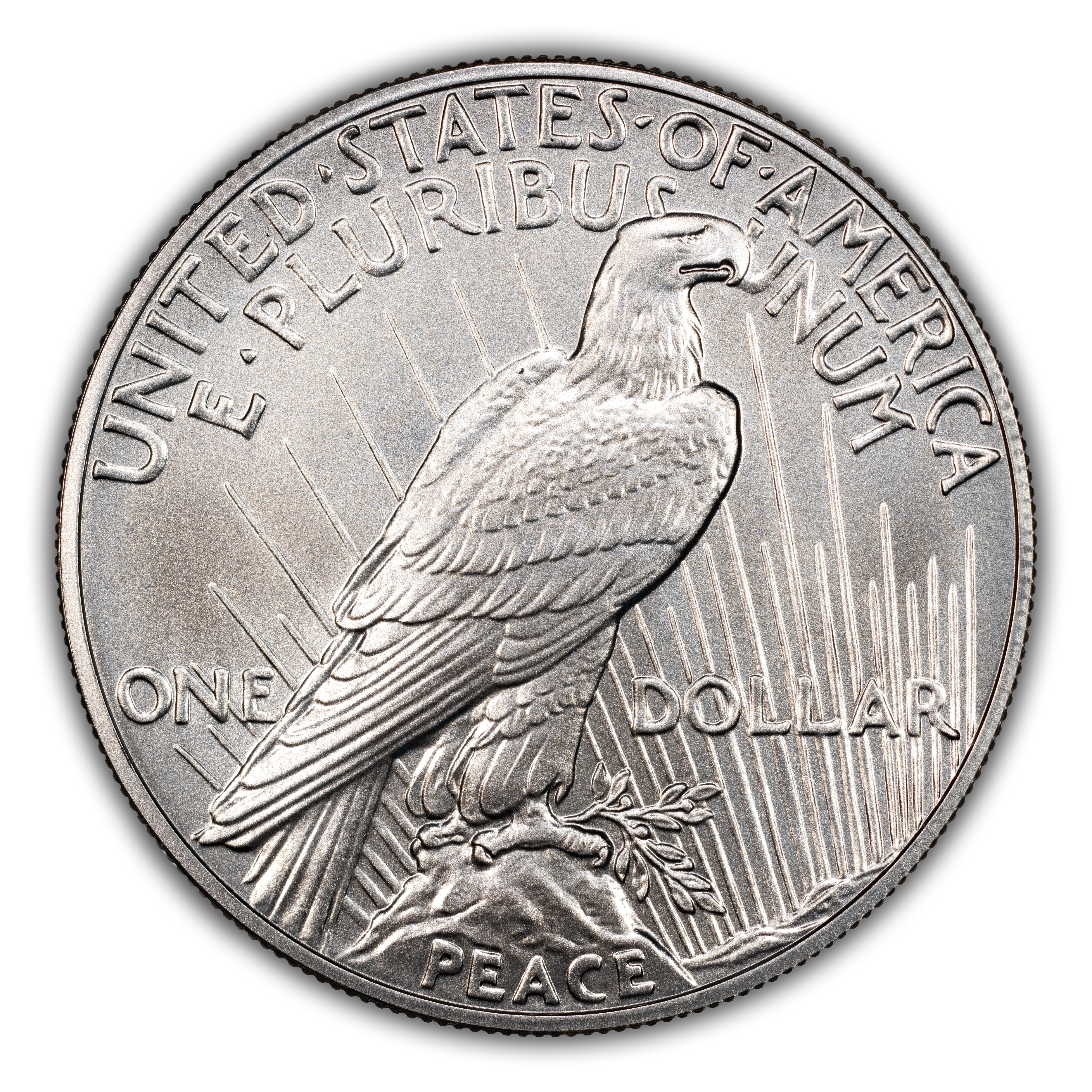 Reverse: The reverse depicts an eagle at rest holding an olive branch above the inscription "PEACE." Additional inscriptions are "UNITED STATES OF AMERICA," "E PLURIBUS UNUM," and "ONE DOLLAR."