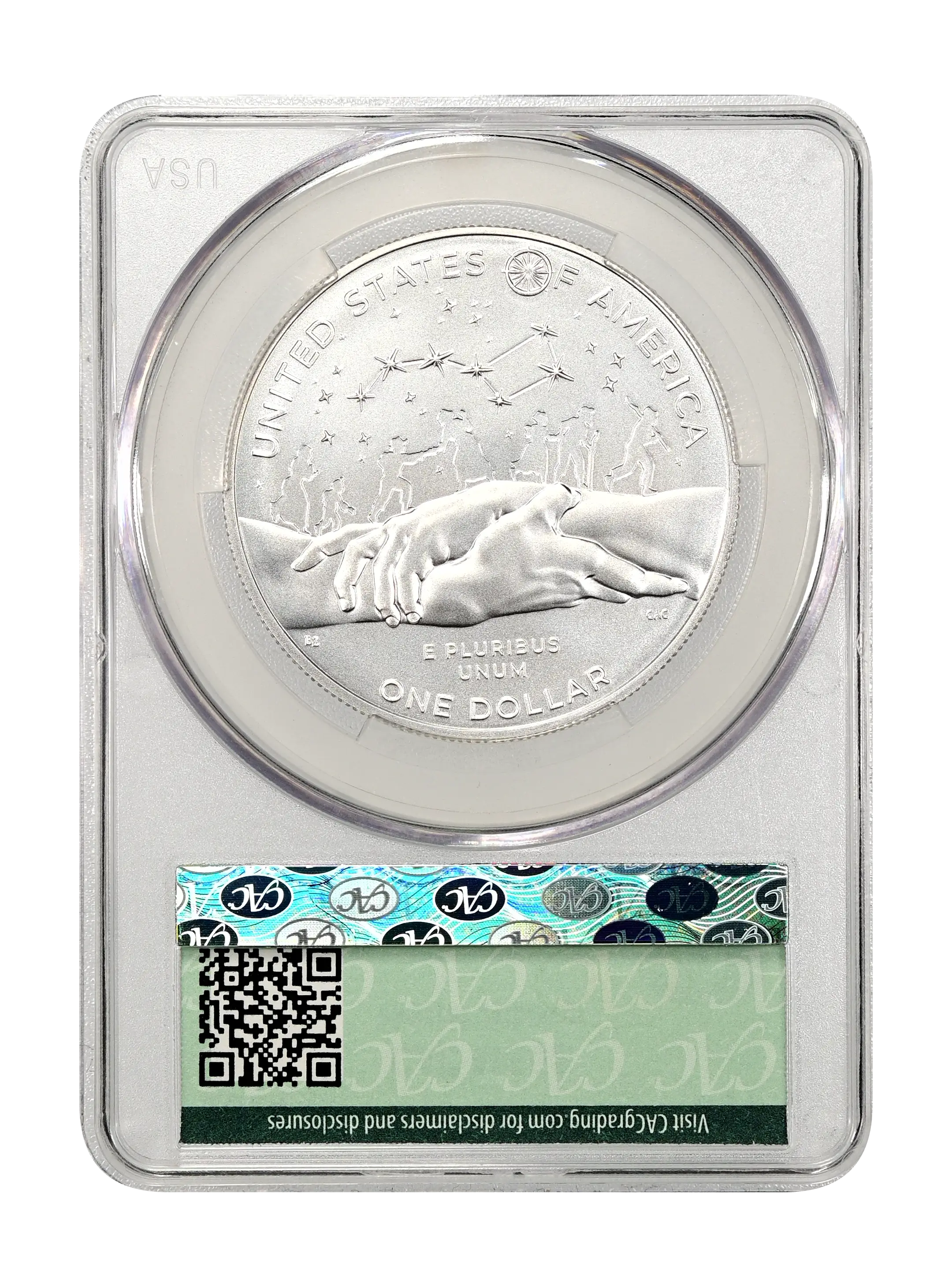 Reverse: The reverse design depicts silhouettes crossing a bridge created by a pair of clasped hands. In the sky, the Big Dipper constellation points to the North Star, which forms the “O” in the word “OF.” Inscriptions include “UNITED STATES OF AMERICA,” “E PLURIBUS UNUM,” and “ONE DOLLAR.”