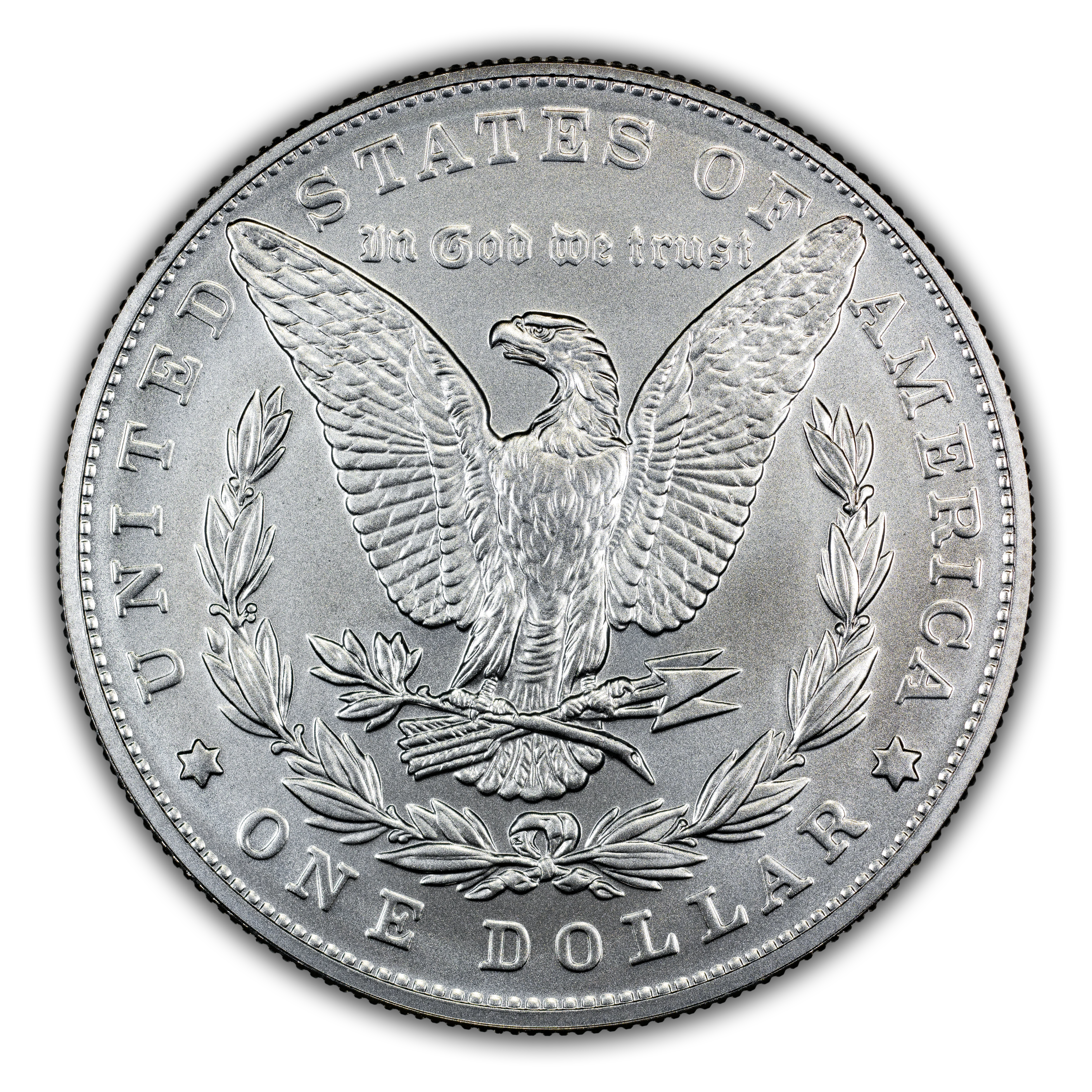 Reverse: The reverse depicts an eagle with outstretched wings clasping arrows and an olive branch, accompanied by a wreath. Reverse inscriptions are "UNITED STATES OF AMERICA," "IN GOD WE TRUST," and "ONE DOLLAR."