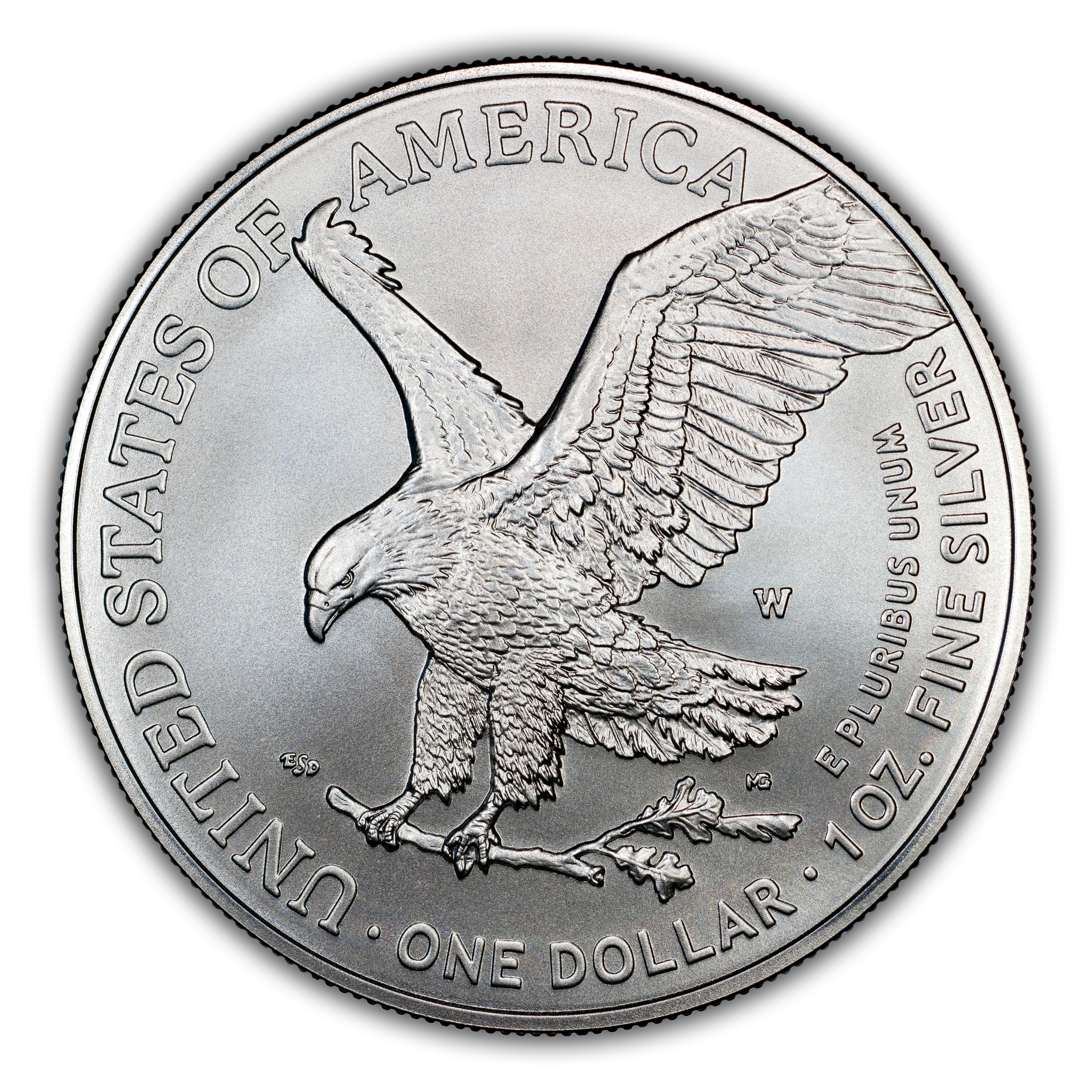 Reverse: The reverse features an eagle as it approaches a landing, carrying an oak branch, as if to add it to a nest. Inscriptions are "UNITED STATES OF AMERICA," "E PLURIBUS UNUM," "1 OZ. FINE SILVER," and "ONE DOLLAR."