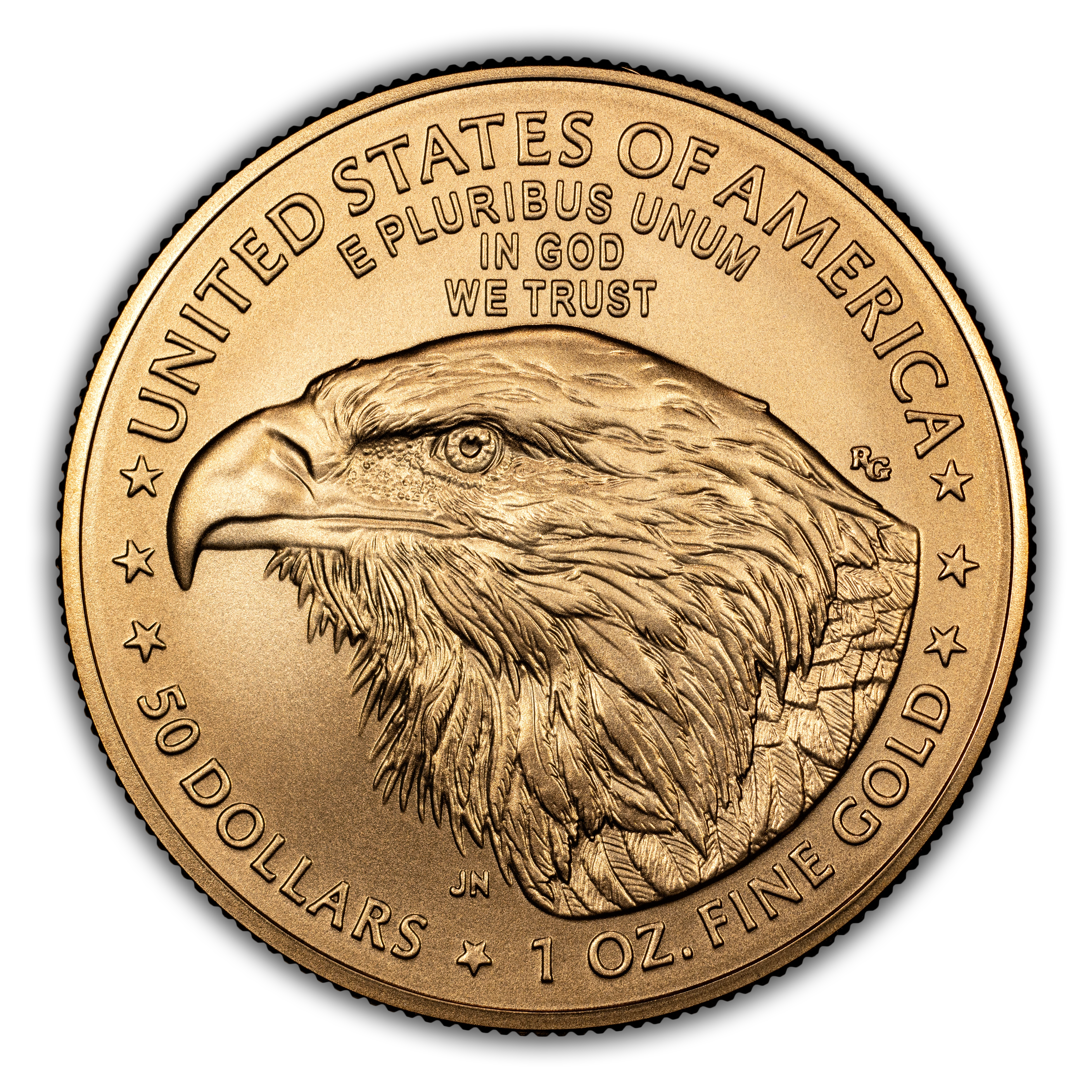 Reverse: A flying eagle is depicted approaching her nest of three waiting eagles accompanied by the words UNITED STATES OF AMERICA, E PLURIBUS UNUM, IN GOD WE TRUST , 1 OZ. FINE GOLD~50 DOLLARS.