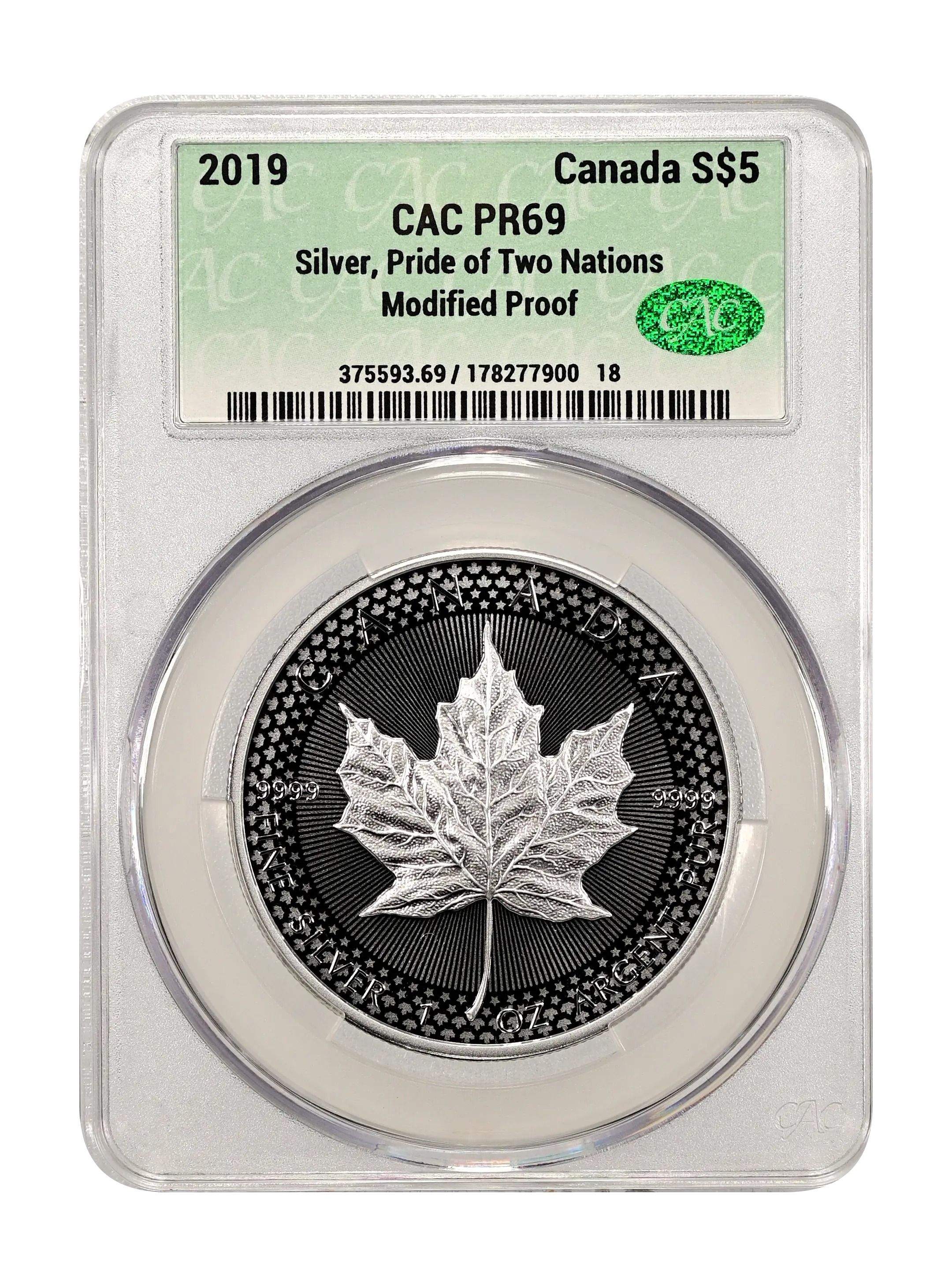 2019 Silver, Pride of Two Nations Canada S$5 Modified Proof (Proof) CAC PR69