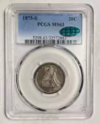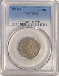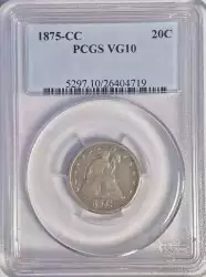 This short-lived coin was authorized by the Act of March 3, 1875. Soon after the appearance of the first twenty-cent pieces, people complained about the similarity in design and size to the quarter dollar. The eagle is very similar to that used on the trade dollar, but the edge of this coin is plain. The mintmark is on the reverse below the eagle. In the denomination's first year, more than one million pieces were struck at the San Francisco Mint; about 133,000 at the Carson City Mint; and roughly 37,000 at Philadelphia (not including about 1,200 Proofs struck there as well). These numbers dropped sharply in 1876. (Most of the Carson City coins of that year were melted at the mint and never released, a fate likely met by most of the Philadelphia twenty-cent pieces of 1876 as well.) In 1877 and 1878, only Proof examples were minted. None were struck for circulation. Various factors caused the demise of the twenty-cent piece: the public was confused over the coin's similarity to the quarter dollar, which was better established as a foundation of American commerce; in the eastern United States, small-change transactions were largely satisfied by Fractional Currency notes; and the twenty-cent coin was essentially just a substitute for two dimes.