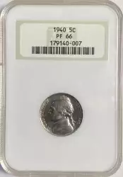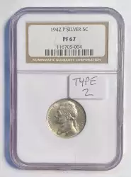 One of the most valuable Jefferson nickel varieties is the 1971 No-S proof, which trades for around $1,000 in nice mid-range proof grades, with better examples snagging higher values. Also notable is the production of the 1942 Type I and 1942-P Type II proofs. 1942 Type I proofs are made from the traditional copper-nickel composition while the 1942-P Type II consists of the World War II-era 35% silver makeup and also is the first proof coin from the Philadelphia Mint bearing a "P" mintmark.