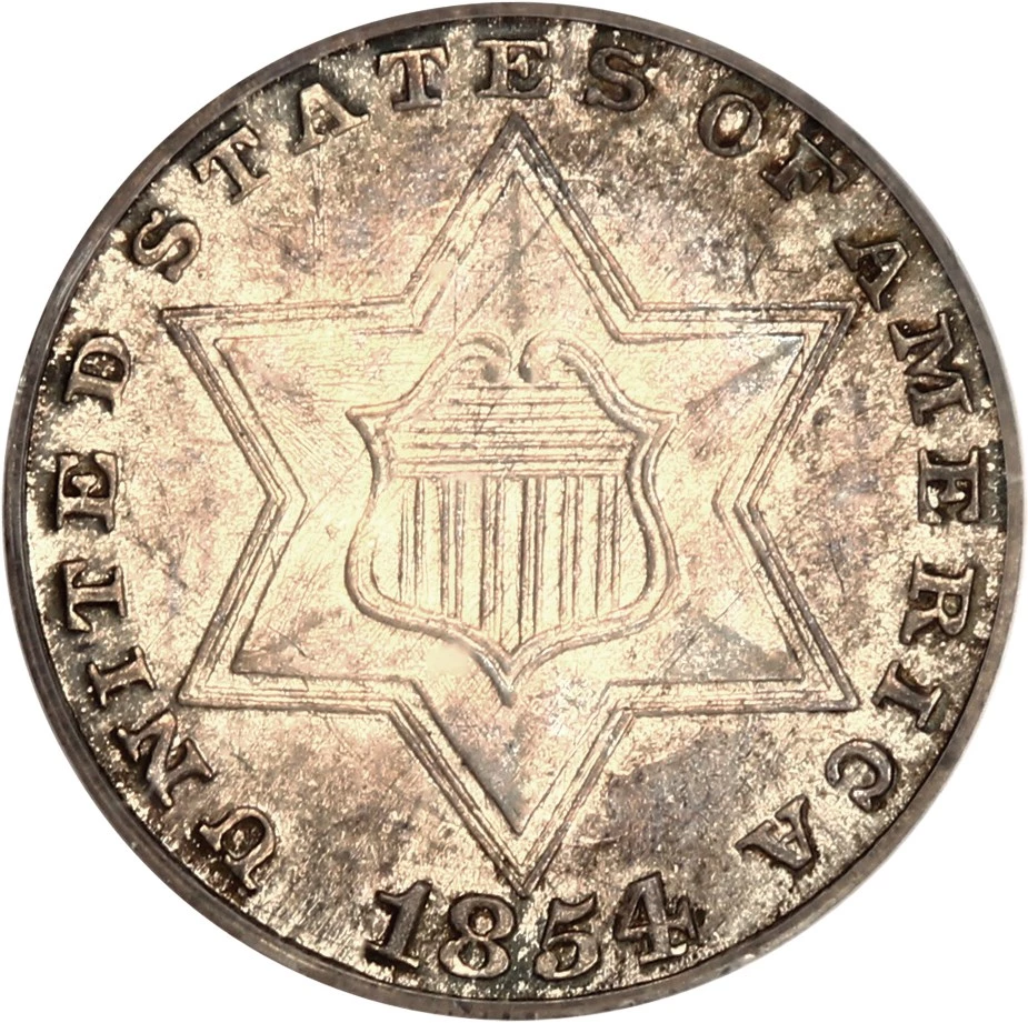 The 3-cent coin also has the reputation of being the nation?s lightest coin, weighing in at only 0.80 grams upon its debut and eventually being scaled back to only 0.75 grams. There are three major varieties or subtypes within the series. These include the Type I, which was struck from 1851 through 1853 and has the plainest design and is also the most common design variant of the series. The Type II, struck from 1854 through 1858, exhibits a border around the obverse star and has greater ornamentation around the "III" on the reverse. Further border enhancements on the obverse star created the third and final subtype, which was minted from 1859 until the end of the series in 1873.
